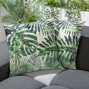 Designed for garden furniture, this set of 2 outdoor cushions bring a tropical vibe with painted-effect green tropical leaves, measuring 45cm x 45cm. Crafted from 100% woven polyester, they offer water and UV resistance, ensuring durability for outdoor use. Add them to your garden furniture for extra cushiony comfort.