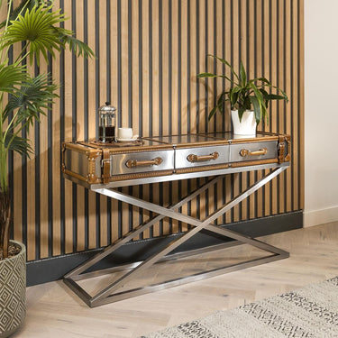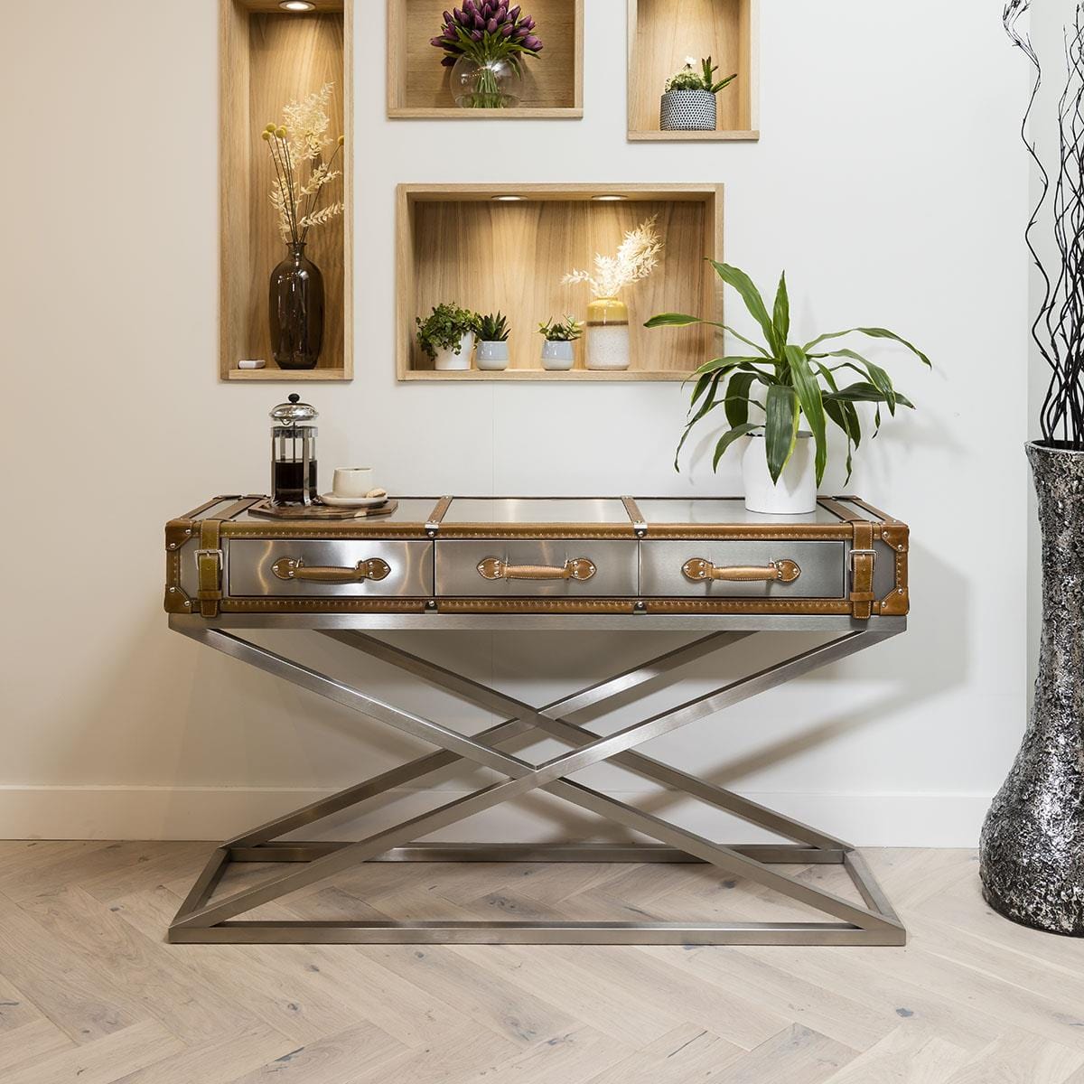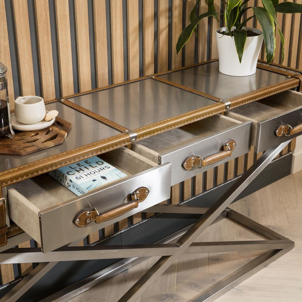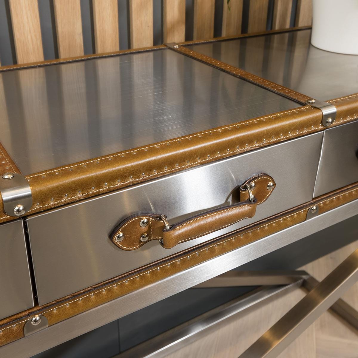 This ExDisplay Bernardi console table has three drawers atop a sturdy X-shaped stainless steel base. The latest in our Industrial range, this stunning hallway table is designed to bring a focal point into any room. The stunning trunk style table features three drawers with premium leather detailing and straps. PLEASE NOTE THIS UNIT IS EXDISPLAY AND DOES SHOW SOME SIGNS OF USE AND IMPERFECTION ON THE TOP, SEE IMAGES FOR DETAILS.