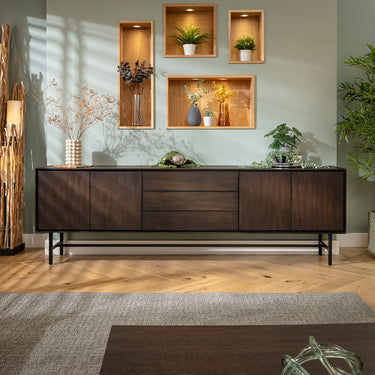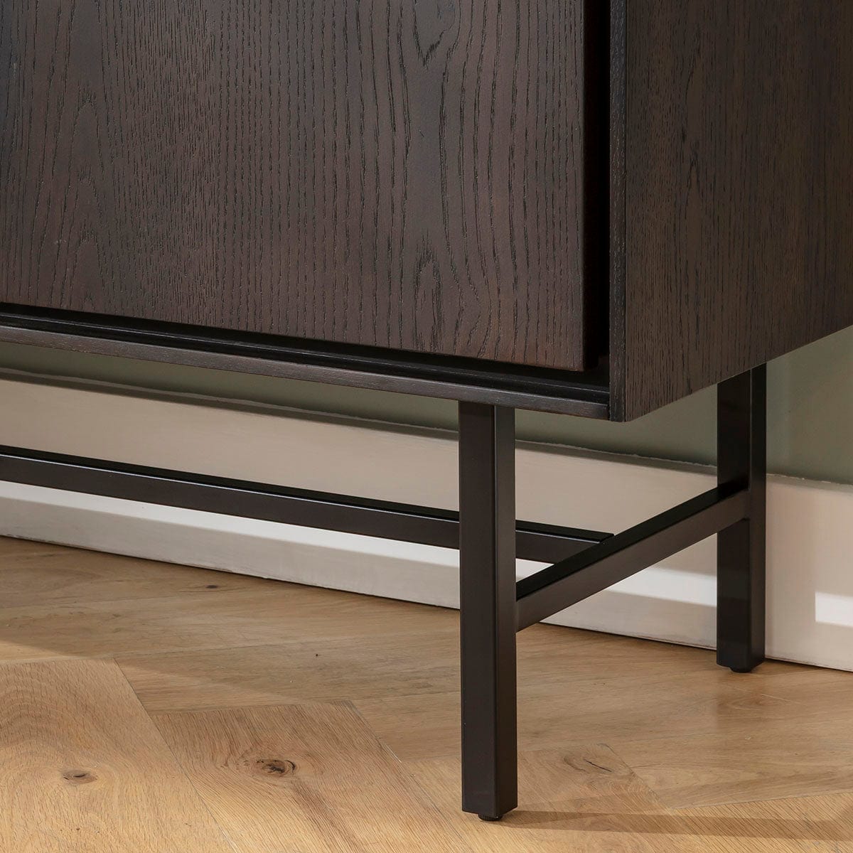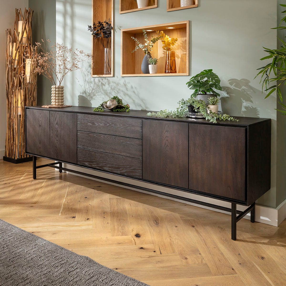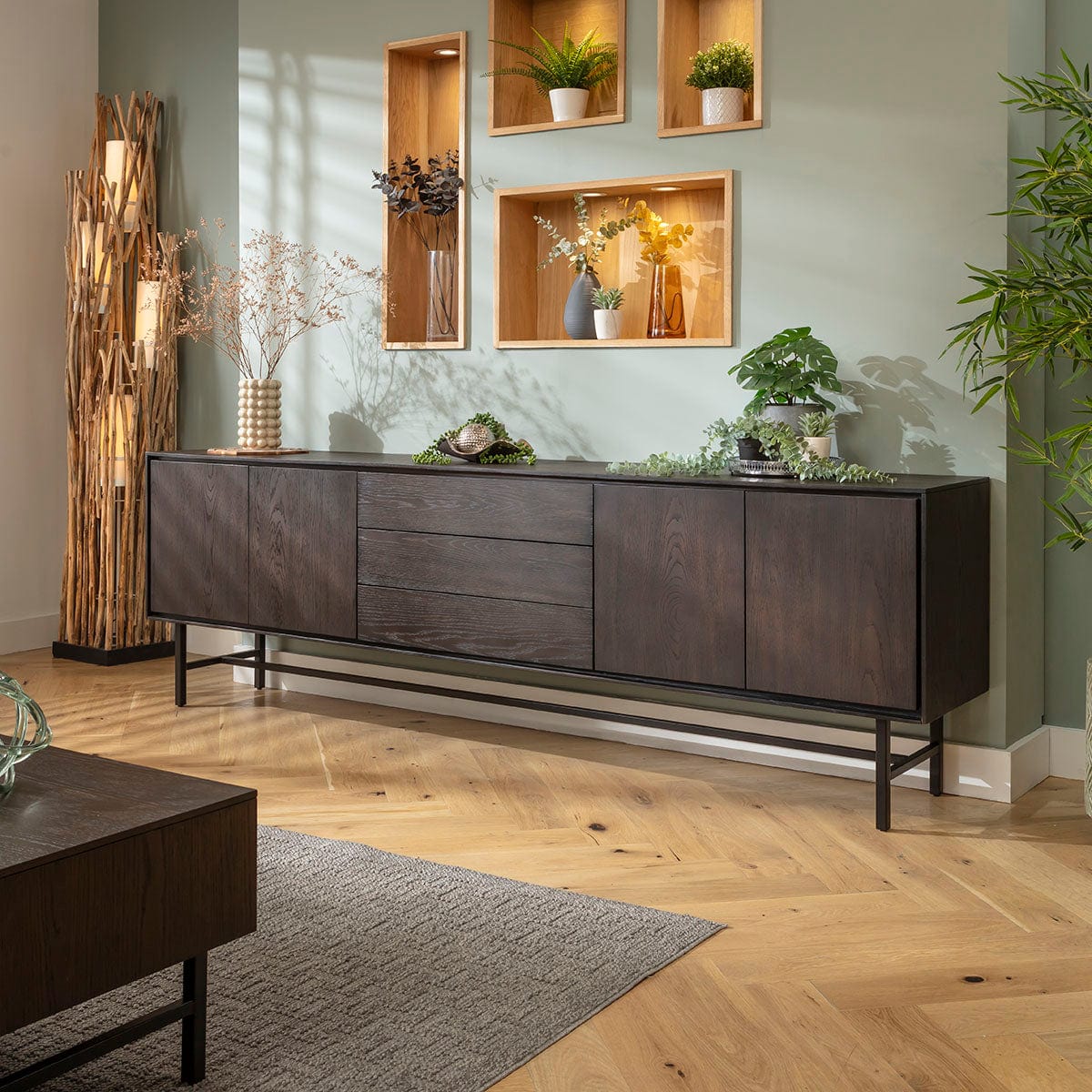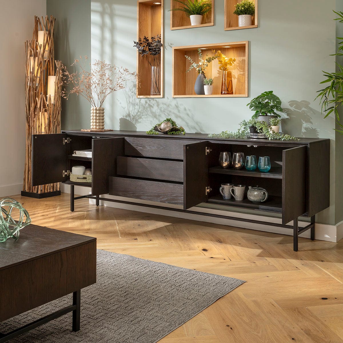 Measuring 240cm wide, this extra wide sideboard showcases a refined modern design with bold, minimalist styling. The dark oak veneer brings warmth and elegance, balanced with sleek black metal legs that elevate the unit to 75cm high. Push-close drawers and cupboards highlight its premium build, making it a striking contemporary sideboard for generous interiors.
