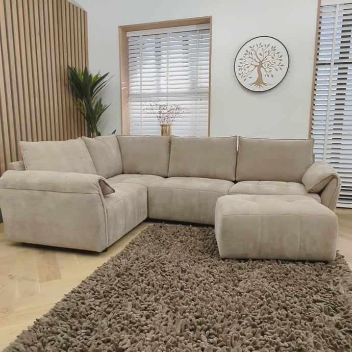 This Jasmin sofa is part of a premium modular sofa system, featuring three sofa sections. At 251cm wide, it includes one middle section, with left and right armed sections. The fully modular design means it can be expanded with additional Jasmin sofa modules. It boasts a stylish, curvy shape and a unique folded-over arm design, with clean lines, detailed stitching, thick piping, and low-profile 6cm feet that define the look.