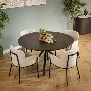 This 4 seater dining table and chair set includes a small round dining table crafted from dark oak veneer and a super-sturdy black metal star base, with cream carver dining chairs with arms, featuring a curved back and modern boucle fabric upholstery . This modern dining set is crafted for durability and comfort.