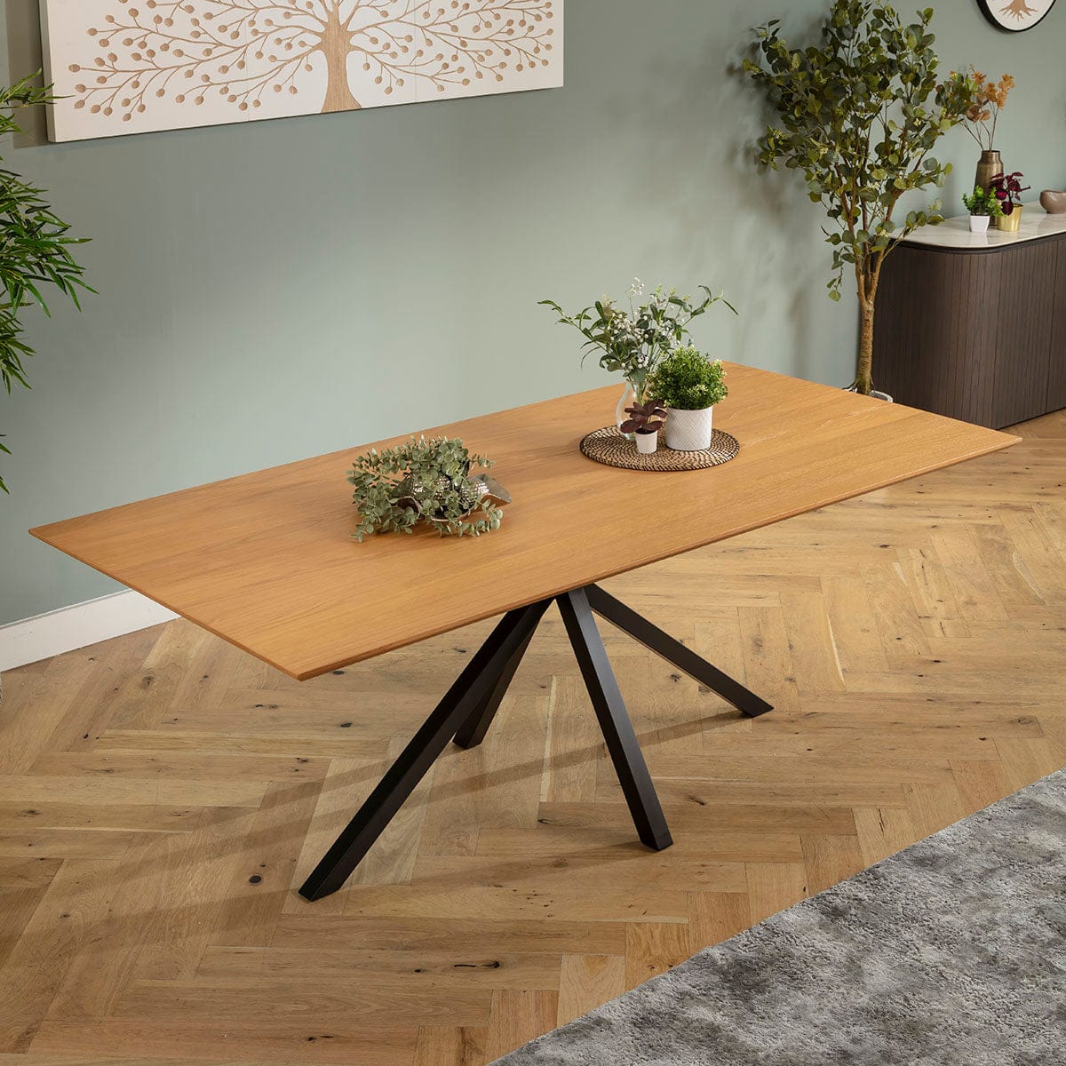 This dining table measures 210cm x 100cm and 77cm in height, providing a spacious 8 seater surface. Its light oak veneer top showcases a tactile grain, paired with a super-sturdy black metal star base. The sleek, modern design enhances any room, combining durability with style. Ideal as a dining table for 8, it brings elegance to contemporary interiors without compromising functionality. Please note this table has minor defects on the tabletop, as shown in the product images. While the images illustrate possible imperfections, the table you receive is brand-new and boxed, so defects may differ. These minor issues are already reflected in the discounted price. We are unable to unbox the table before delivery, ensuring you still receive a high-quality, modern dining room table.