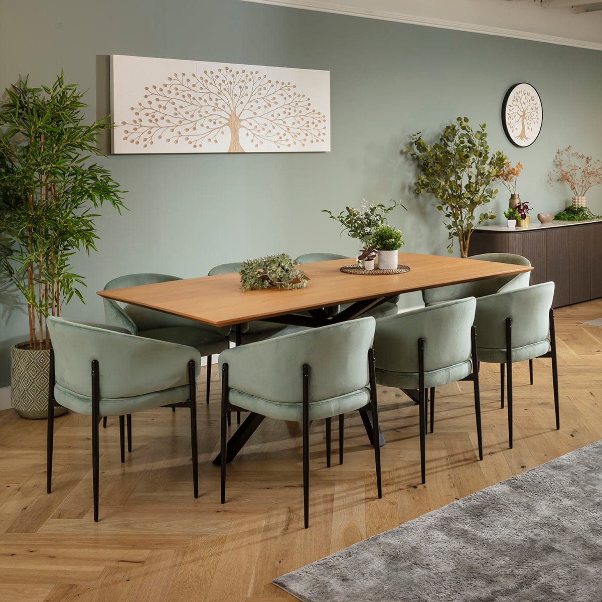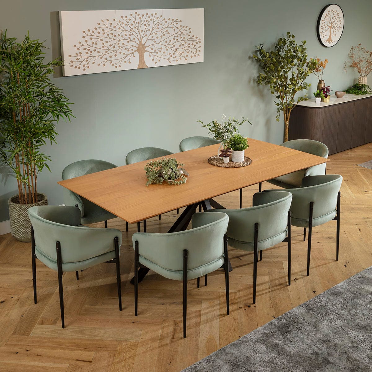 This 8 seater dining table and chair set includes a modern dining table crafted from light oak veneer and a super-sturdy black metal star base, with green velvet dining chairs featuring a chic carver design with arms and black metal legs. This modern dining set is crafted for durability and comfort.