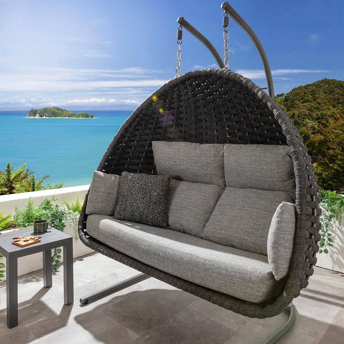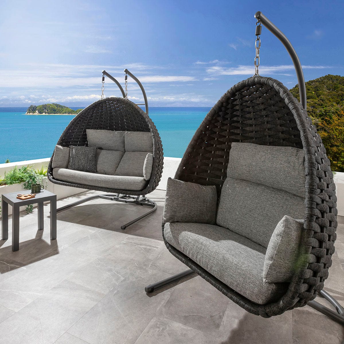 The Sundowner single and double hanging egg chair set in smoke grey is a set of modern garden egg chairs crafted for stylish outdoor living. The grey two person garden egg chair combines the appeal of a double hanging chair with the comfort of a luxury swing chair, with a matching single chair. Designed as modern garden swing chairs in sleek grey tones, the set delivers the presence of luxury outdoor hanging chairs while elevating patios, terraces, and landscaped spaces with contemporary sophistication.