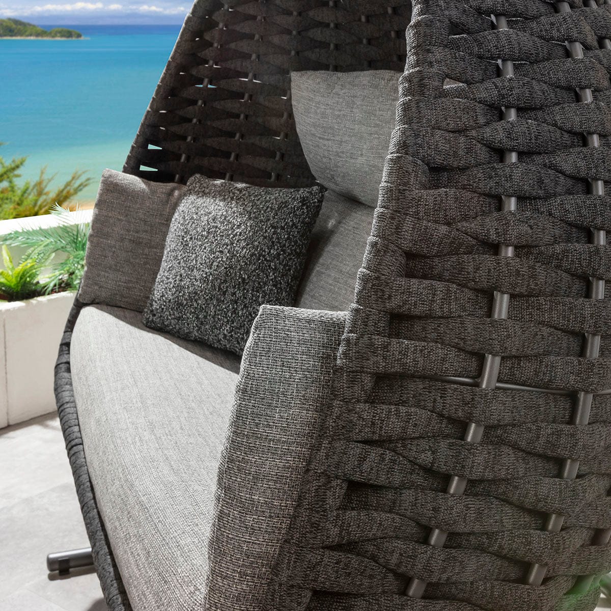 This premium egg chair set is formed from light yet durable aluminium baskets, finished in charcoal grey Sundowner Signature rope weave - a premium outdoor material. Sofa-inspired luxury cushions in smoke grey fabric provide indulgent comfort and should be stored when not in use. Suspended from a grey powder-coated steel frame for superior strength, its sleek silhouette reflects a market-leading design. Beige weather covers are included to guard against garden debris.
