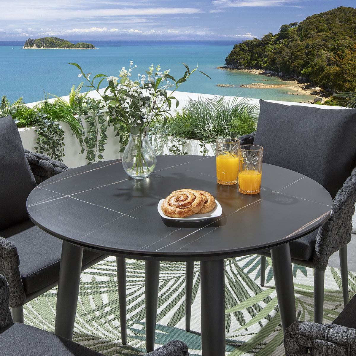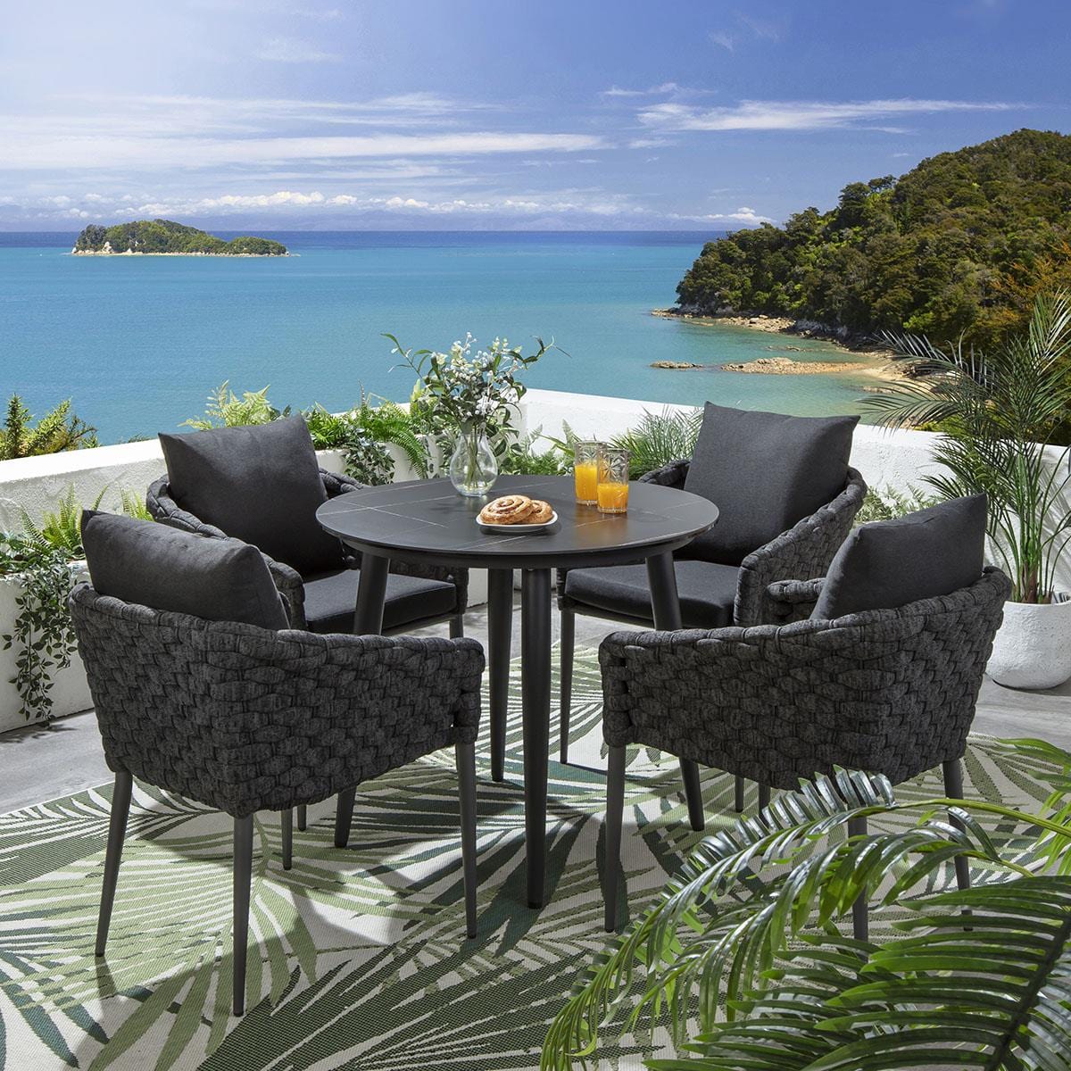 This 4 seater garden table and chairs set includes luxury aluminium garden dining chairs in an elegant grey and the signature thick rope weave, with a robust ceramic round garden dining table with a black marble-effect finish, on an aluminium frame. This outdoor dining set is crafted for durability and comfort.