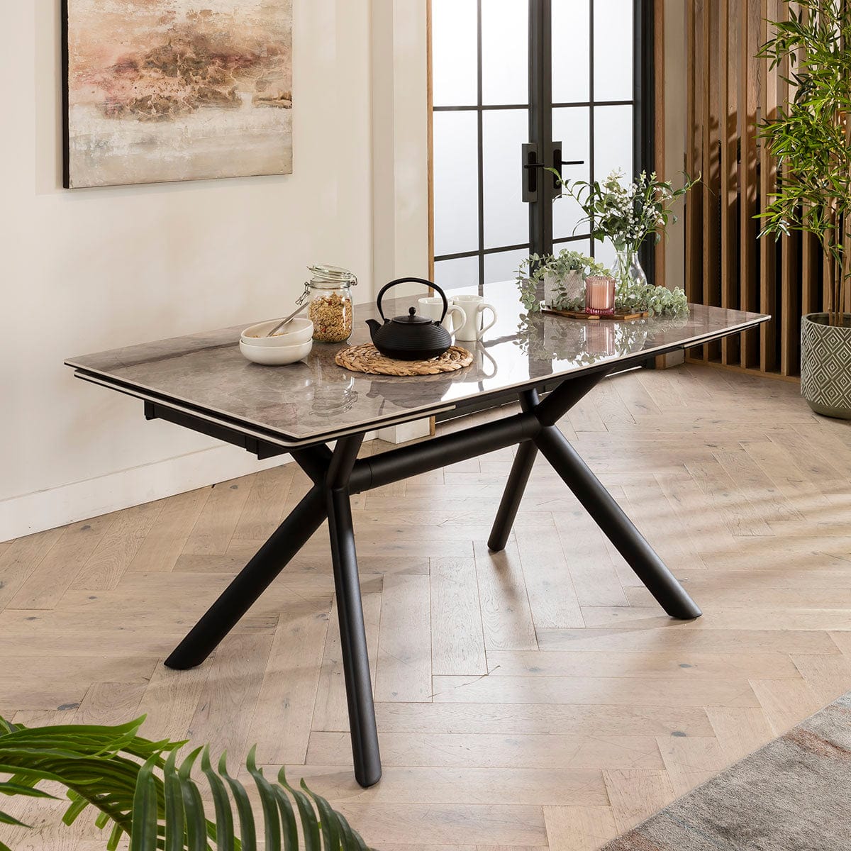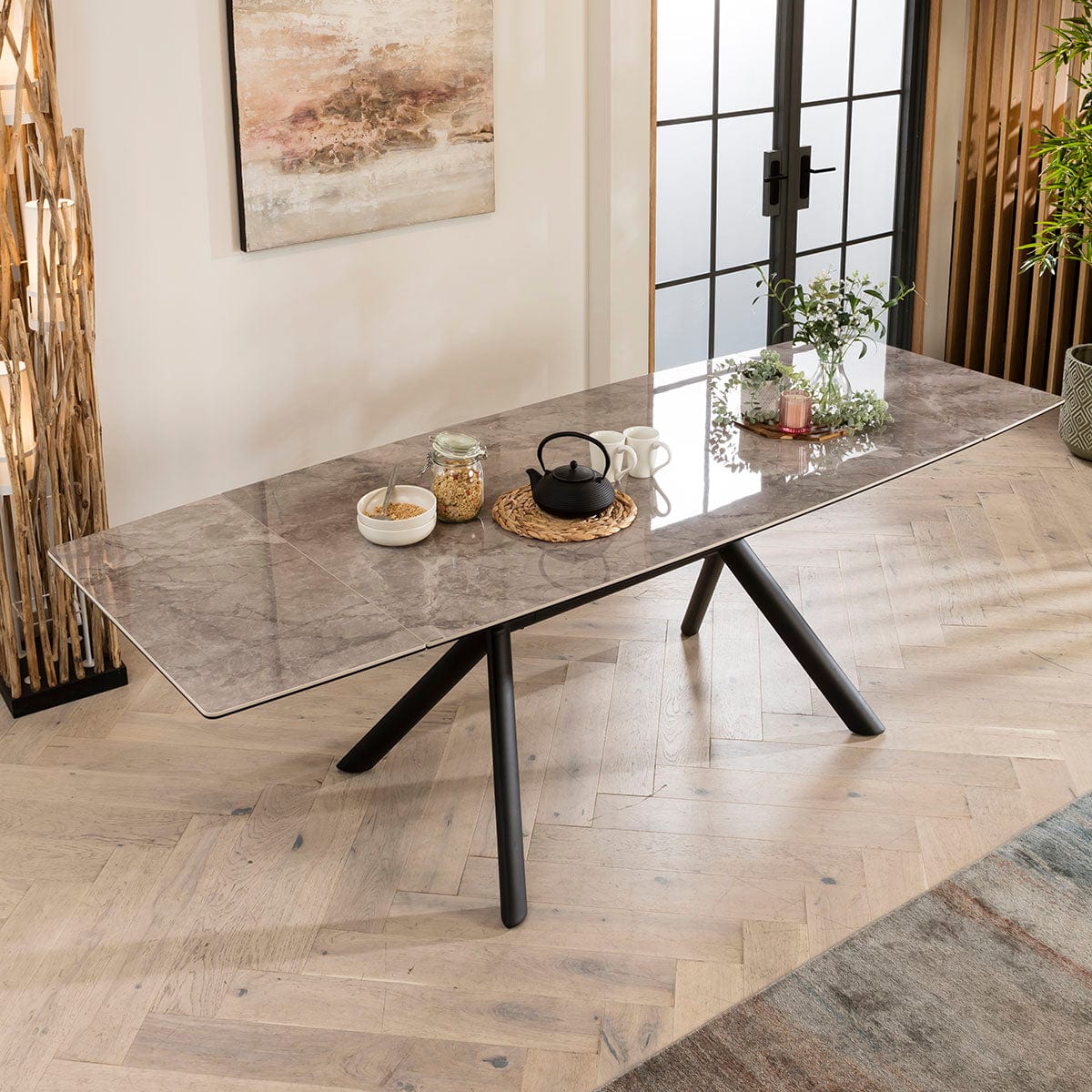 Dine in luxury with our modern ceramic marble dining table designed to seat 8 people. This extending dining table set features a grey marble effect ceramic top, ensuring durability against scratches, stains, and heat. With unique metal legs, this modern dining table provides a sturdy base with plenty of legroom.
