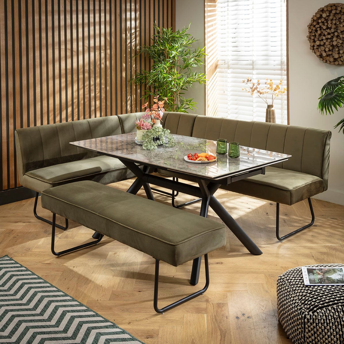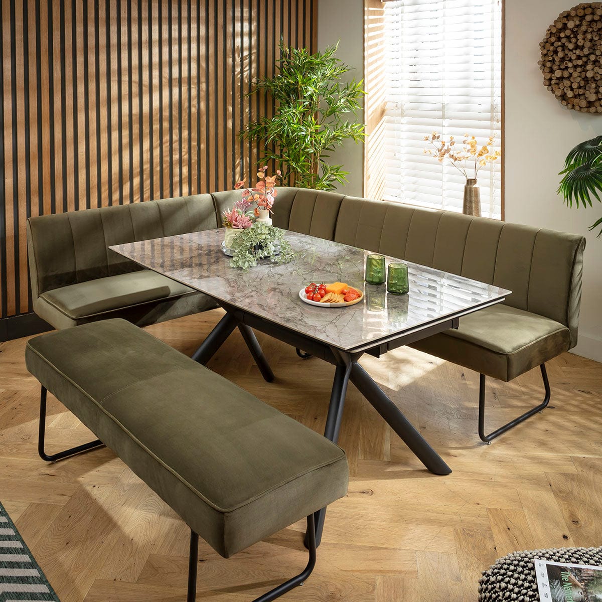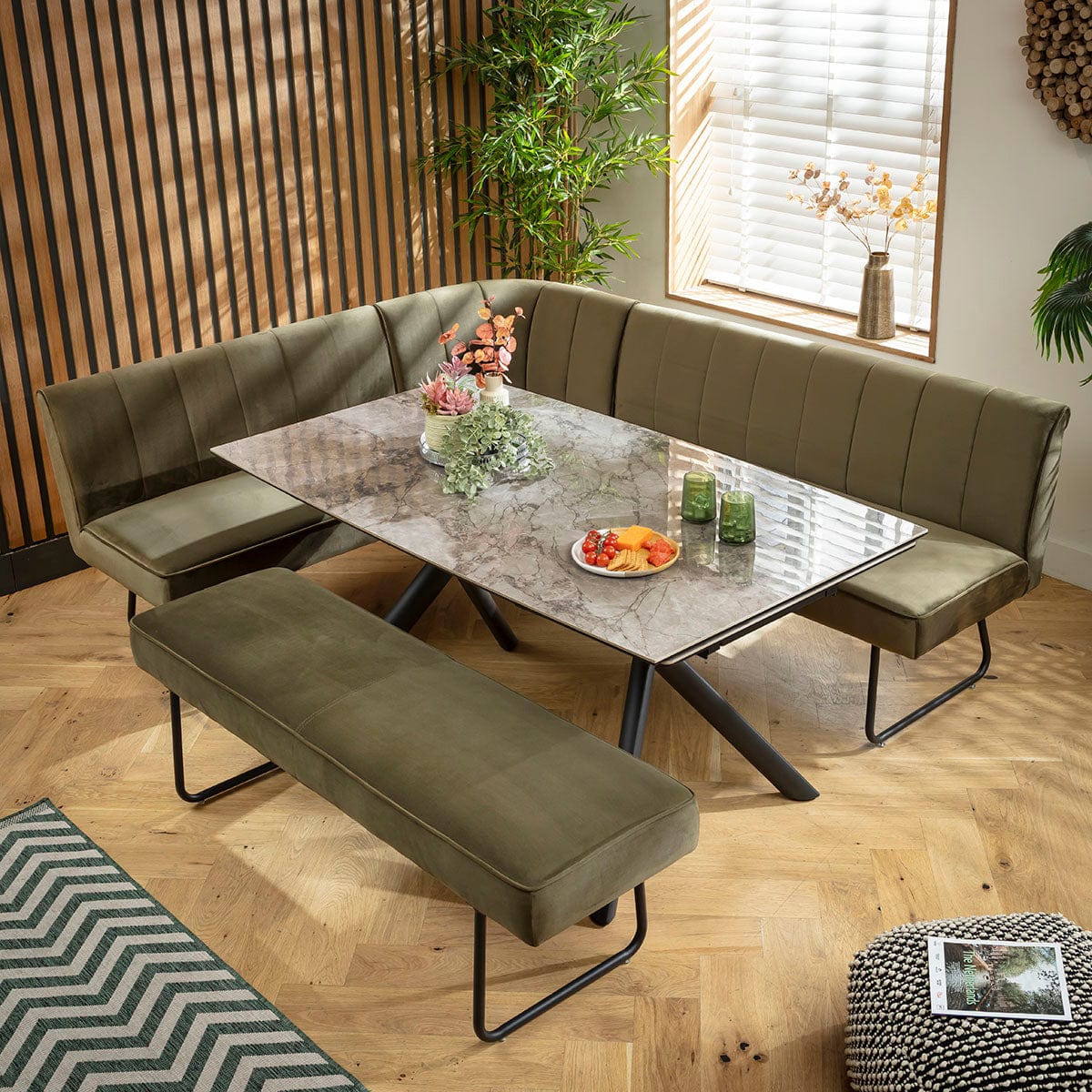 This 8 seater corner bench dining set includes a luxury extendable dining table adorned with a modern marble-effect ceramic top in grey, with a Deco corner dining bench and a backless bench in premium green velvet upholstery. This corner dining set is crafted for practicality and comfort.