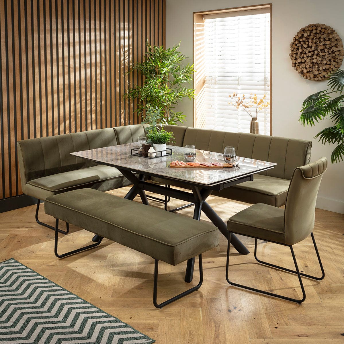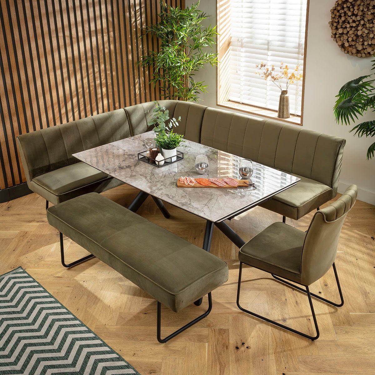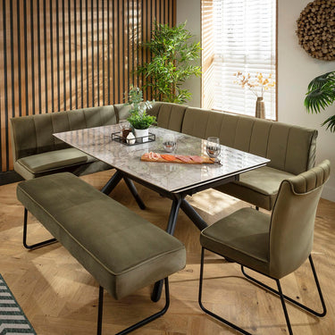This 9 seater corner bench dining set includes a luxury extendable dining table adorned with a modern marble-effect ceramic top in grey, with a Deco corner dining bench, backless bench and chair in green velvet upholstery. This corner dining set is crafted for practicality and comfort.