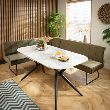 The Deco Corner Dining Bench is a versatile and stylish seating solution for any dining space. The corner bench can comfortably seat up to 5 people. Kitchen dining benches offer a perfect gathering spot for friends and family. The premium olive green velvet upholstery is luxurious in its richness and vibrancy.
