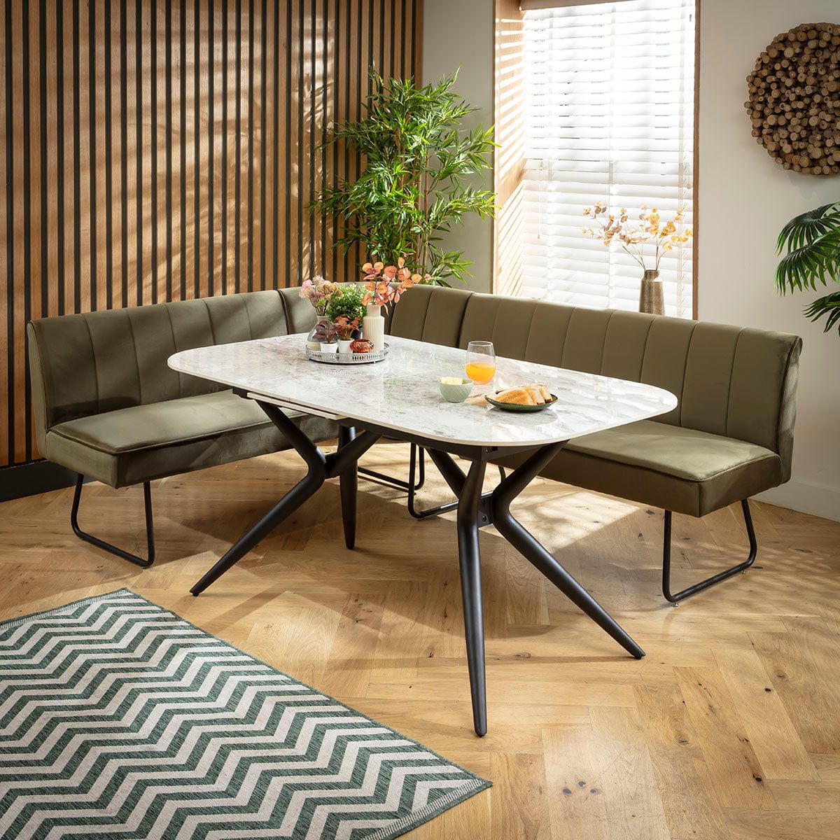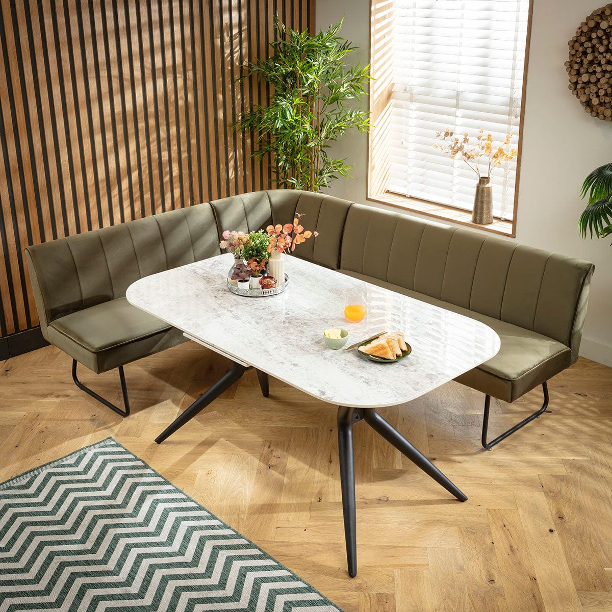 This 5 seater corner bench dining set includes our modern extendable dining table, it has a premium grey ceramic marble top and metal legs, with the Deco corner dining bench in premium green velvet upholstery and black metal legs. This corner dining set is crafted for practicality and comfort.