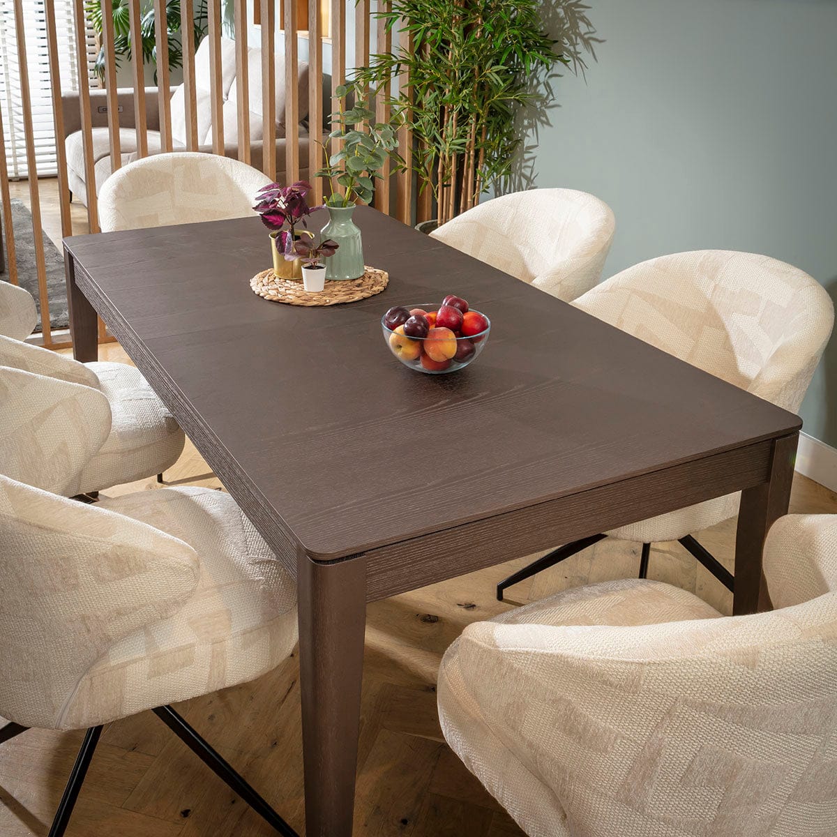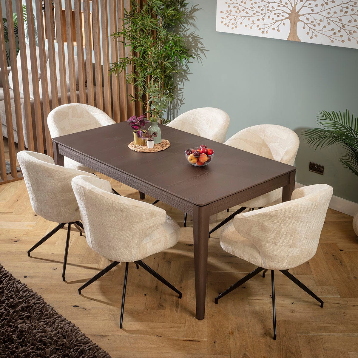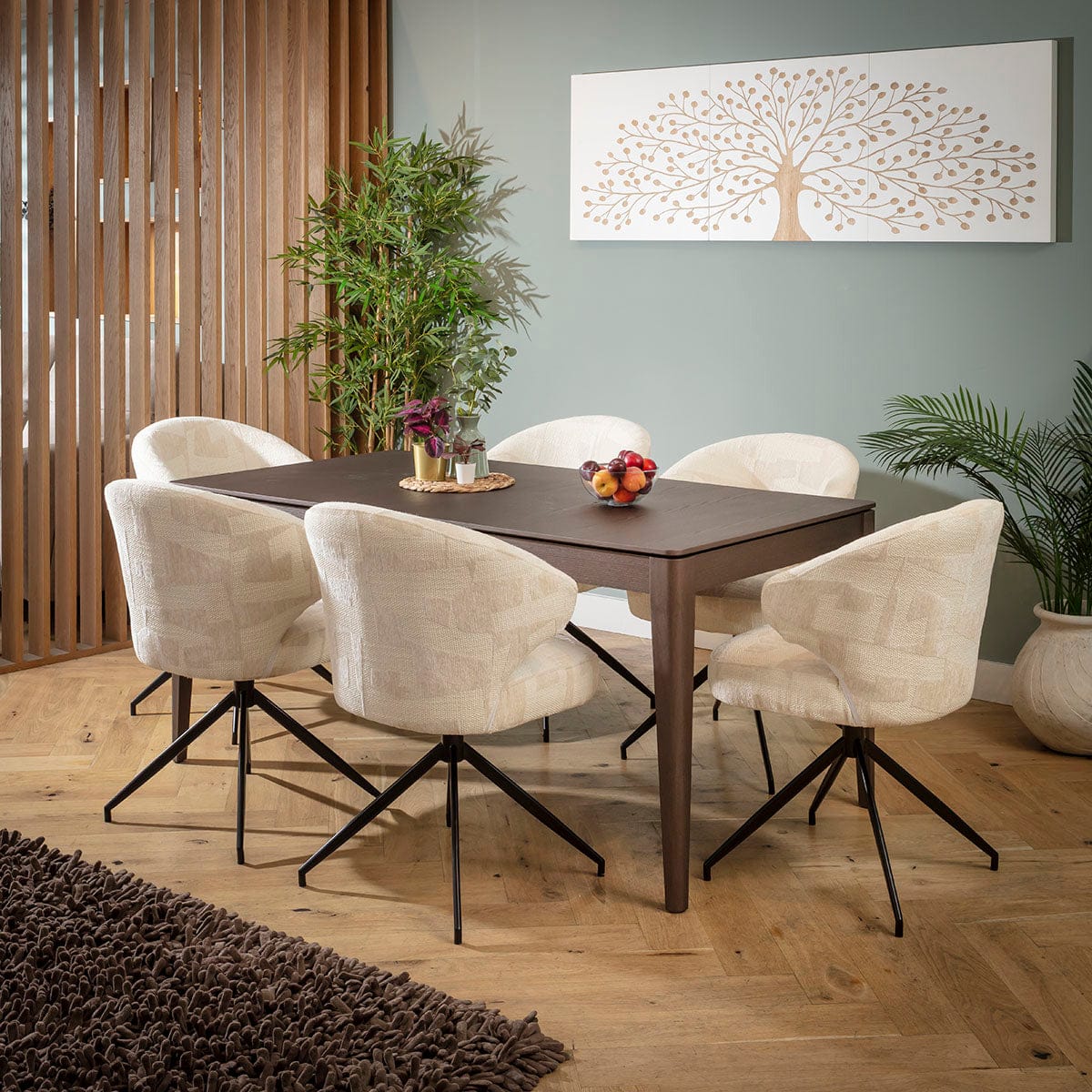 This 6 seater dining table and chair set includes a large extendable wooden dining table showcasing a brown oak veneer and a tactile wood grain, with unique cream dining chairs that make a statement featuring textured weave and soft chenille. This modern dining set is crafted for durability and comfort.