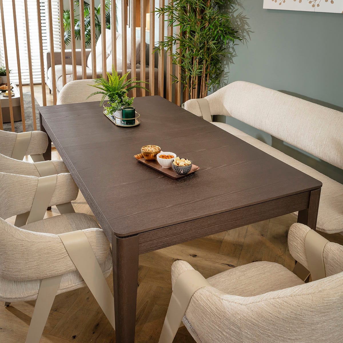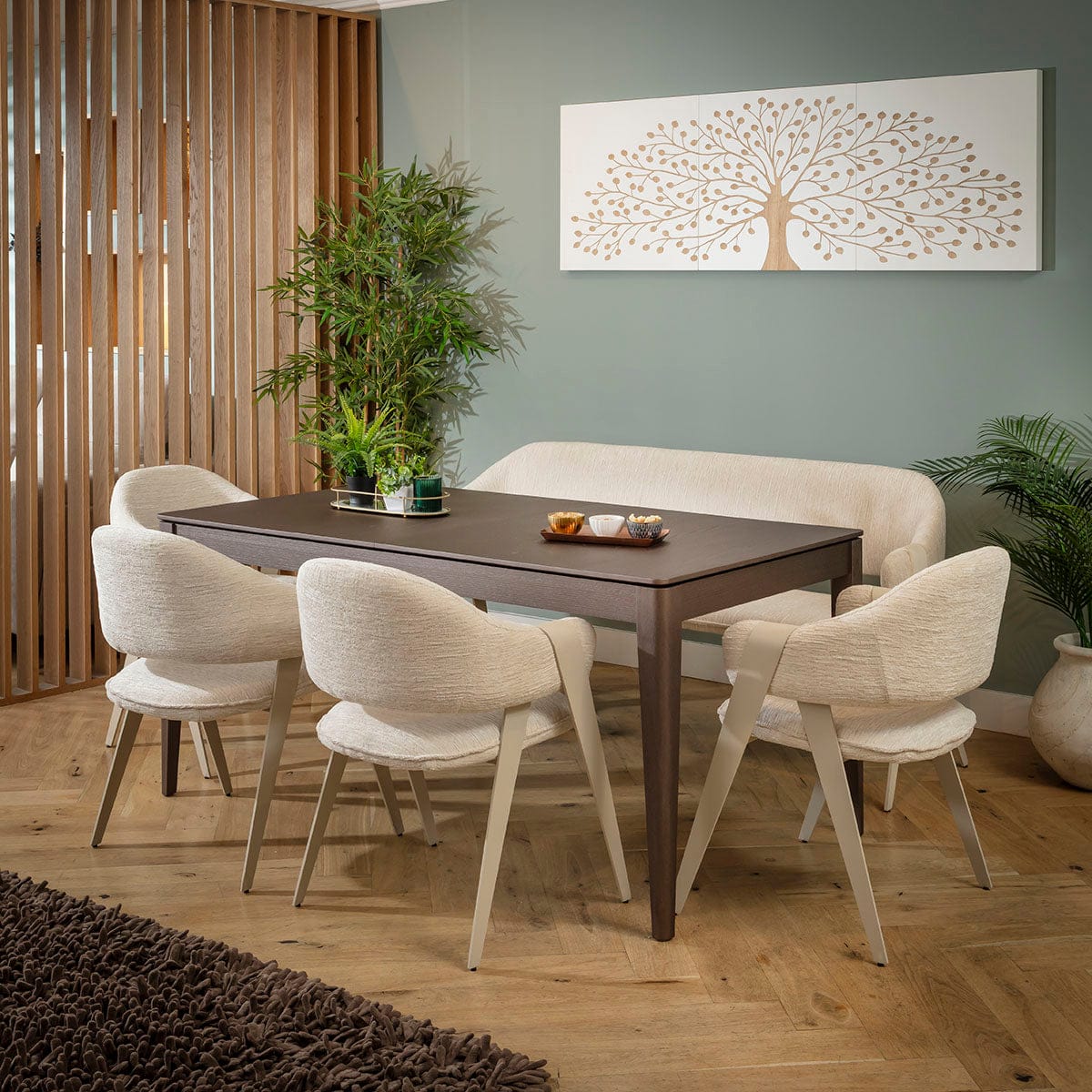 This 7 seater bench dining set includes a large extendable wooden dining table showcasing a brown oak veneer and a tactile wood grain, with a Freya dining bench featuring a supportive backrest, plus 4 chairs in super-soft cream fabric. This modern dining set is crafted for practicality and comfort.