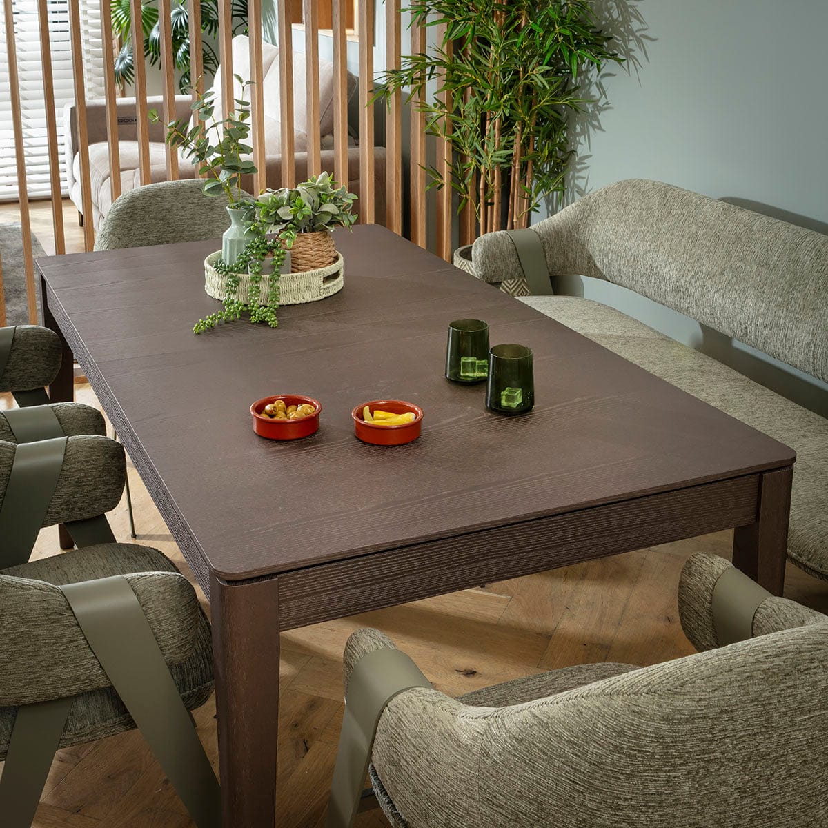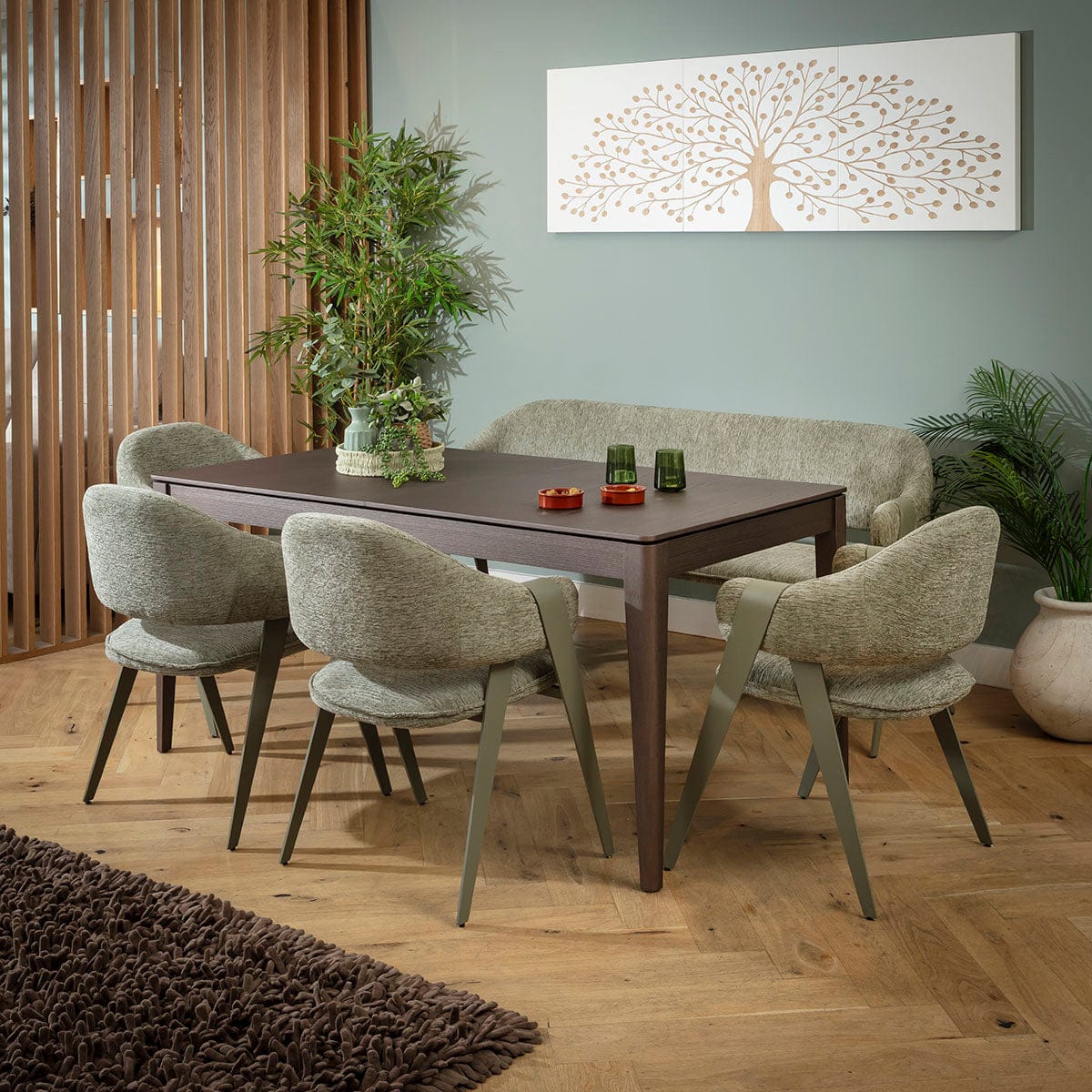 This 7 seater bench dining set includes a large extendable wooden dining table showcasing a brown oak veneer and a tactile wood grain, with a Freya dining bench featuring a supportive backrest, plus 4 chairs in super-soft green fabric. This modern dining set is crafted for practicality and comfort.