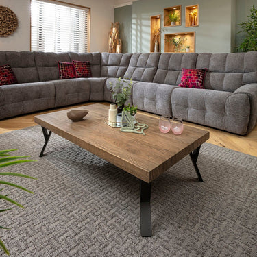 This industrial coffee table combines reclaimed oak with bold metal detailing, creating a striking balance of rustic and modern style. A large coffee table with deep grained texture, it offers generous surface space while exuding character. Among wooden coffee tables, this oak design stands out as a timeless, durable centrepiece.