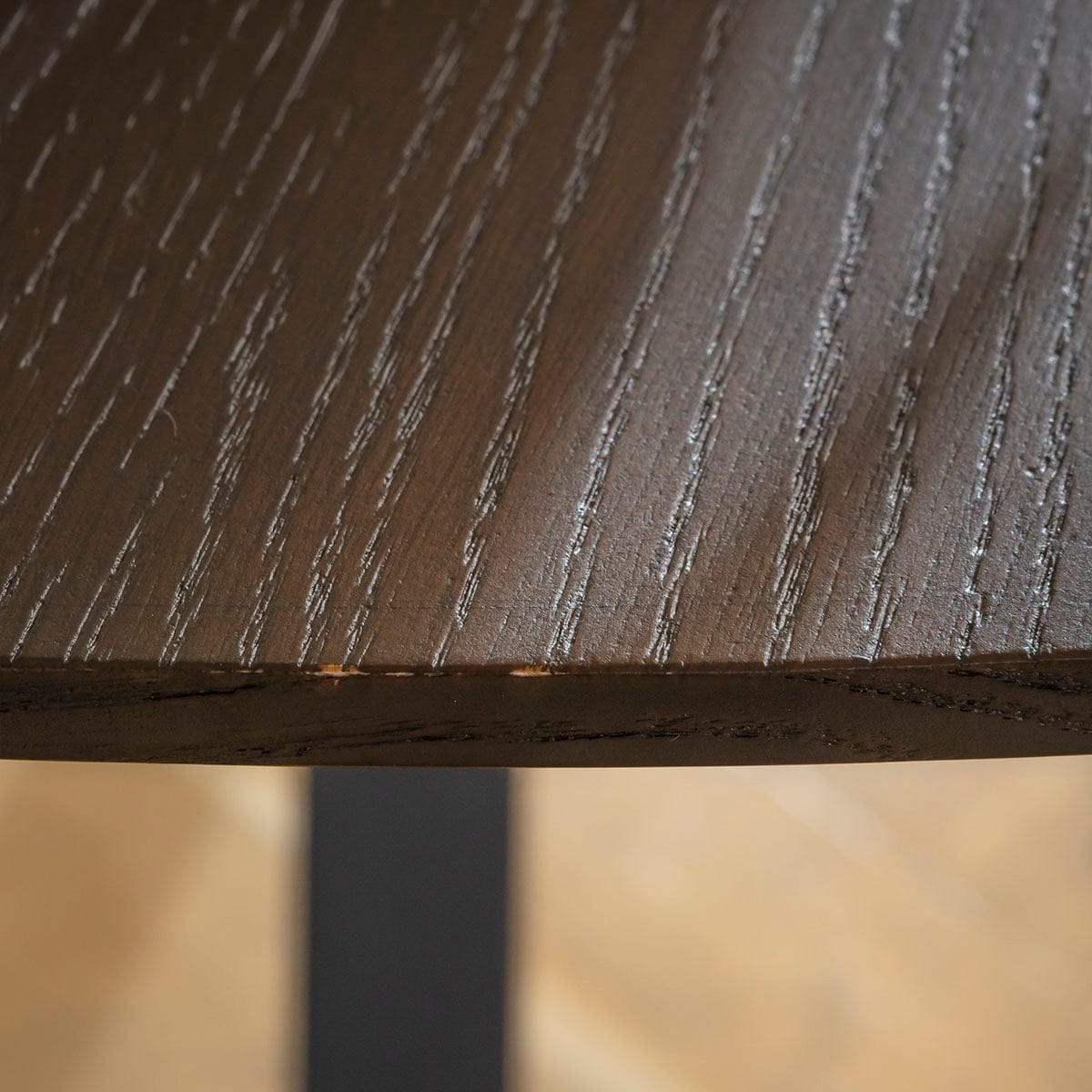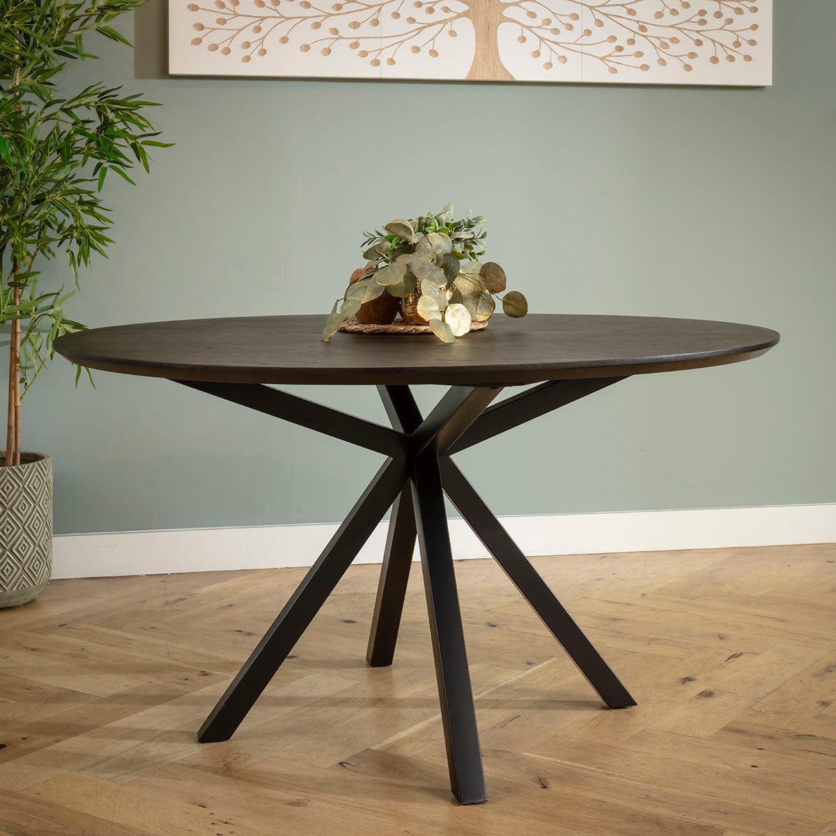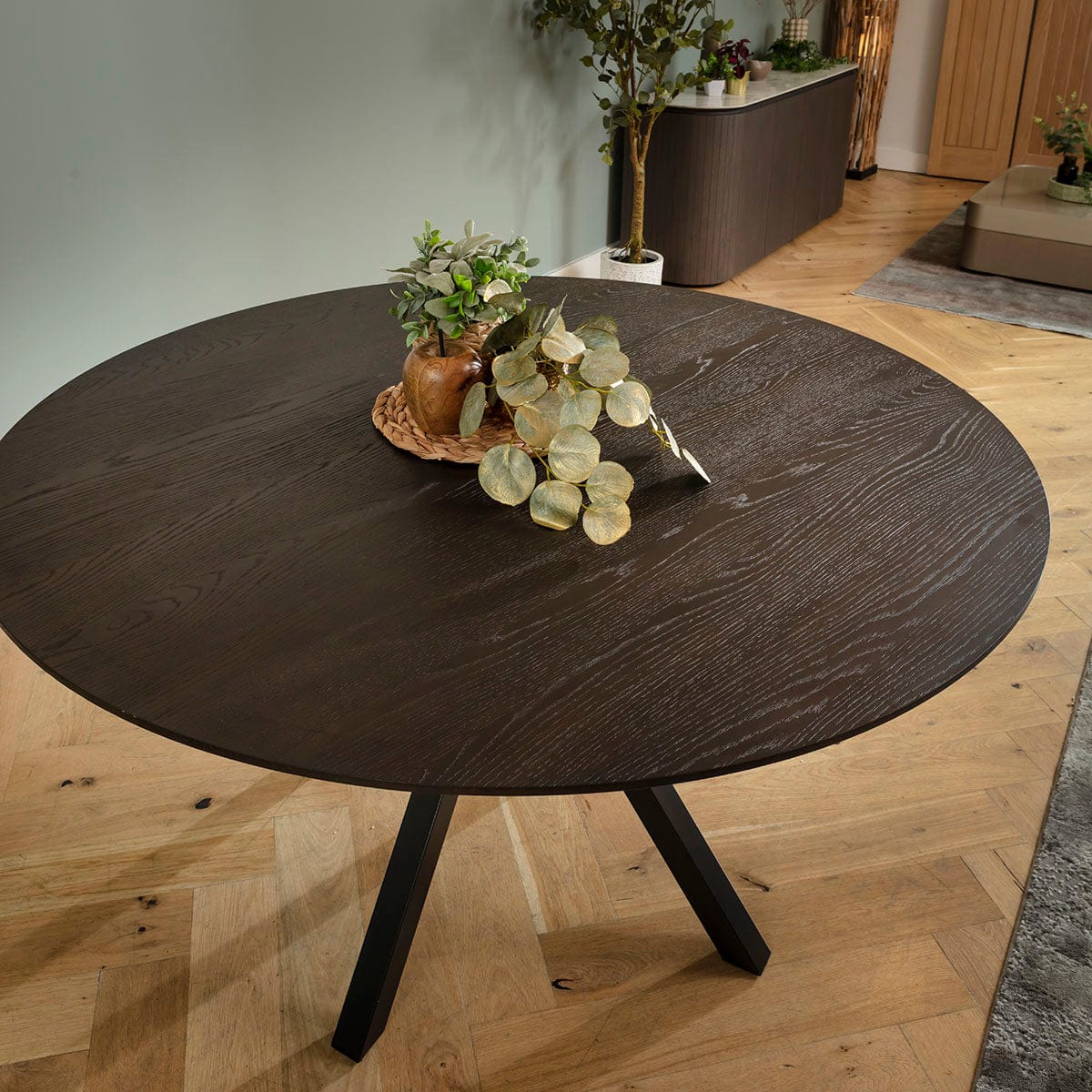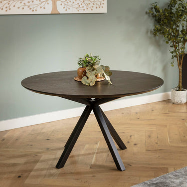 This round dining table combines modern design with practical functionality, ideal for contemporary interiors. Featuring a dark oak veneer top and sleek black metal star base, this oak dining table offers a tactile, visually appealing surface. Its compact yet spacious dimensions create a comfortable four-seater arrangement, making it a standout piece in any modern dining room setting.