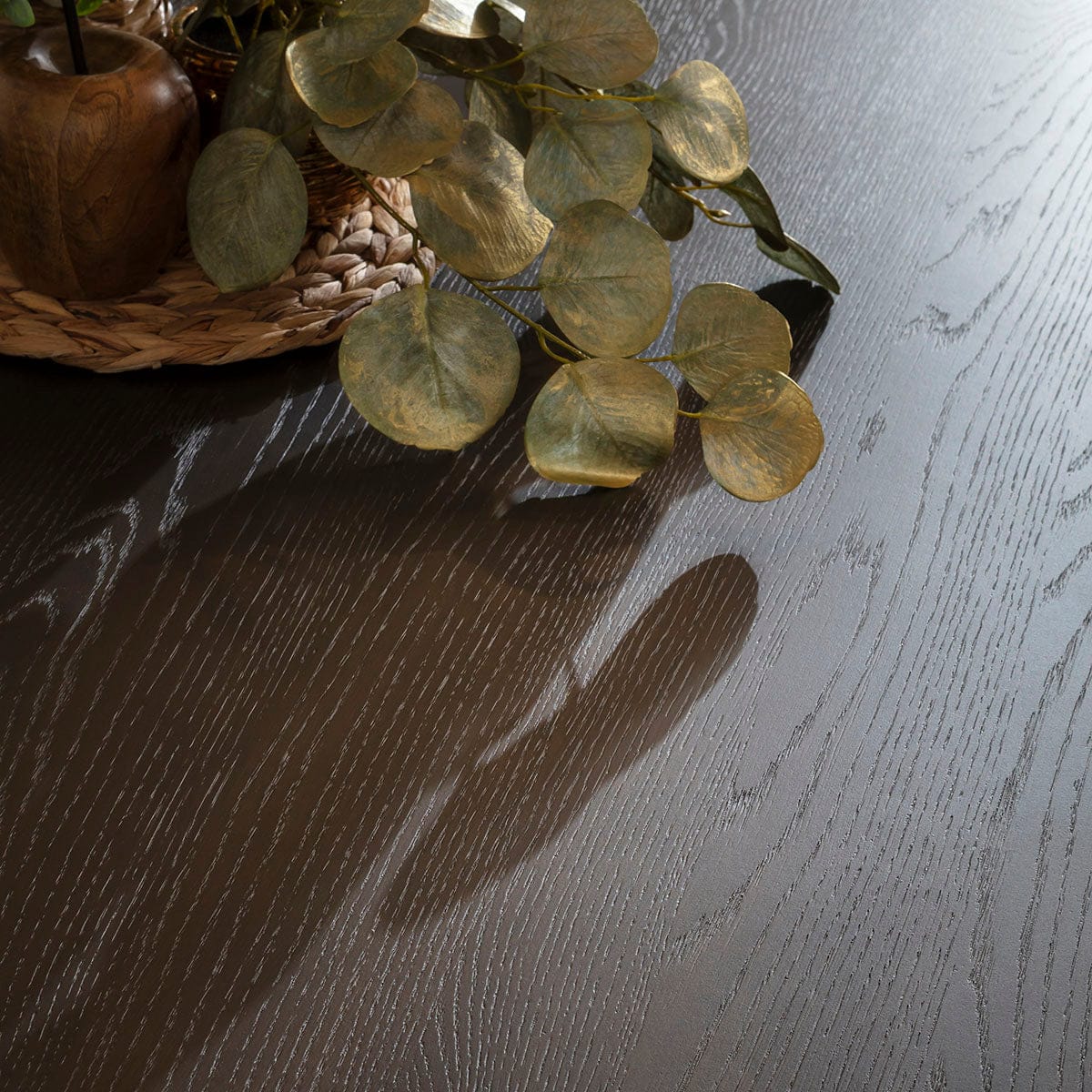 This small, round dining table measures 140cm in diameter and 77cm in height, providing a spacious four-seater surface. Its dark oak veneer top showcases a tactile grain, paired with a super-sturdy black metal star base. The sleek, modern design enhances any room, combining durability with style. Ideal as an oak dining table, it brings elegance to contemporary interiors without compromising functionality.