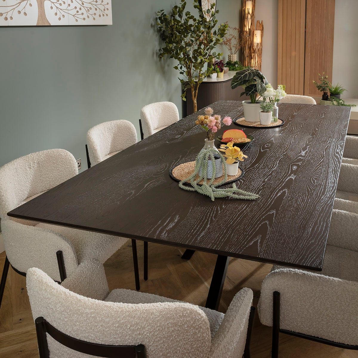 This dining table measures 240cm x 105cm and 77cm in height, providing a spacious ten-seater surface. Its dark oak veneer top showcases a tactile grain, paired with a super-sturdy black metal star base. The sleek, modern design enhances any room, combining durability with style. Ideal as a dining table for 10, it brings elegance to contemporary interiors without compromising functionality.