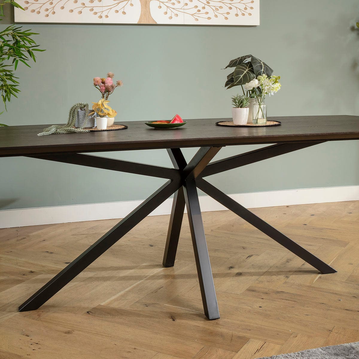 This modern 10 seater dining table combines contemporary design with practical functionality, ideal for contemporary interiors. Featuring a dark oak veneer top and sleek black metal star base, this oak dining table offers a tactile, visually appealing surface. Its spacious dimensions create a comfortable ten-seater arrangement, making it a standout piece in any modern dining room setting.