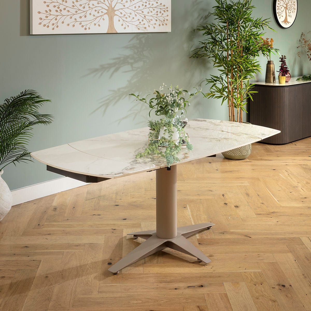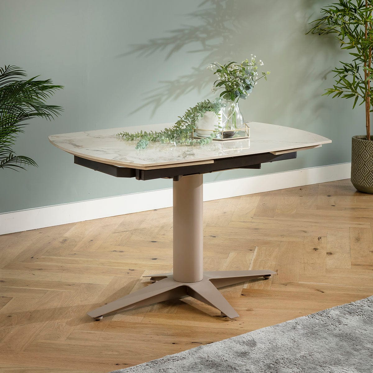 This small extendable dining table introduces a unique colour palette with a white ceramic marble top enhanced by graceful veining. The polished surface offers refinement while ceramic resists scratches, stains and heat. A beige metal base with a distinctive modern silhouette supports the 4 to 6 seater format. Curved edges soften the geometry, giving the piece an elegant, contemporary character.