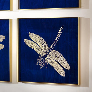 This bold, modern wall art features a handpainted blue and white background with a vibrant dragonfly design, framed in a sleek gold metal frame. Made from wood and metal, this 40cm square piece adds a touch of elegance to any space, perfect for wall decor and large wall artwork in contemporary interiors.