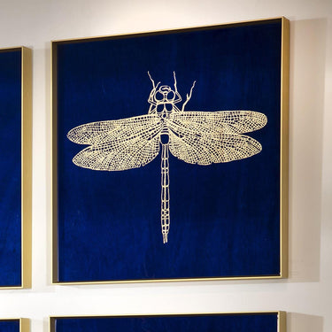 This bold, modern wall art features a handpainted blue and white background with a vibrant dragonfly design, framed in a sleek gold metal frame. Made from wood and metal, this 40cm square piece adds a touch of elegance to any space, perfect for wall decor and large wall artwork in contemporary interiors.
