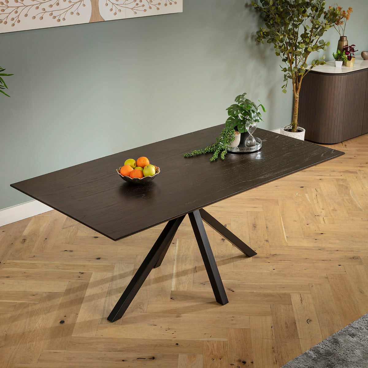 This dining table measures 180cm x 95cm and 77cm in height, providing a spacious 6 seater surface. Its dark oak veneer top showcases a tactile grain, paired with a super-sturdy black metal star base. The sleek, modern design enhances any room, combining durability with style. Ideal as a dining table for 6, it brings elegance to contemporary interiors without compromising functionality. Please note this table has minor defects on the tabletop, as shown in the product images. While the images illustrate possible imperfections, the table you receive is brand-new and boxed, so defects may differ. These minor issues are already reflected in the discounted price. We are unable to unbox the table before delivery, ensuring you still receive a high-quality, modern dining room table.