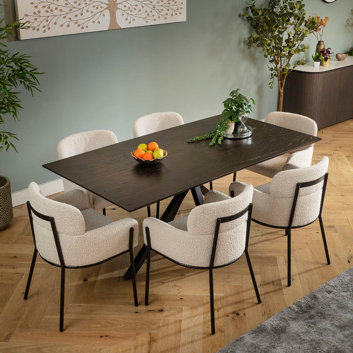 This 6 seater dining table and chair set includes a modern dining table crafted from dark oak veneer and a super-sturdy black metal star base, with cream carver dining chairs with arms, featuring a curved back and modern boucle fabric upholstery . This modern dining set is crafted for durability and comfort.