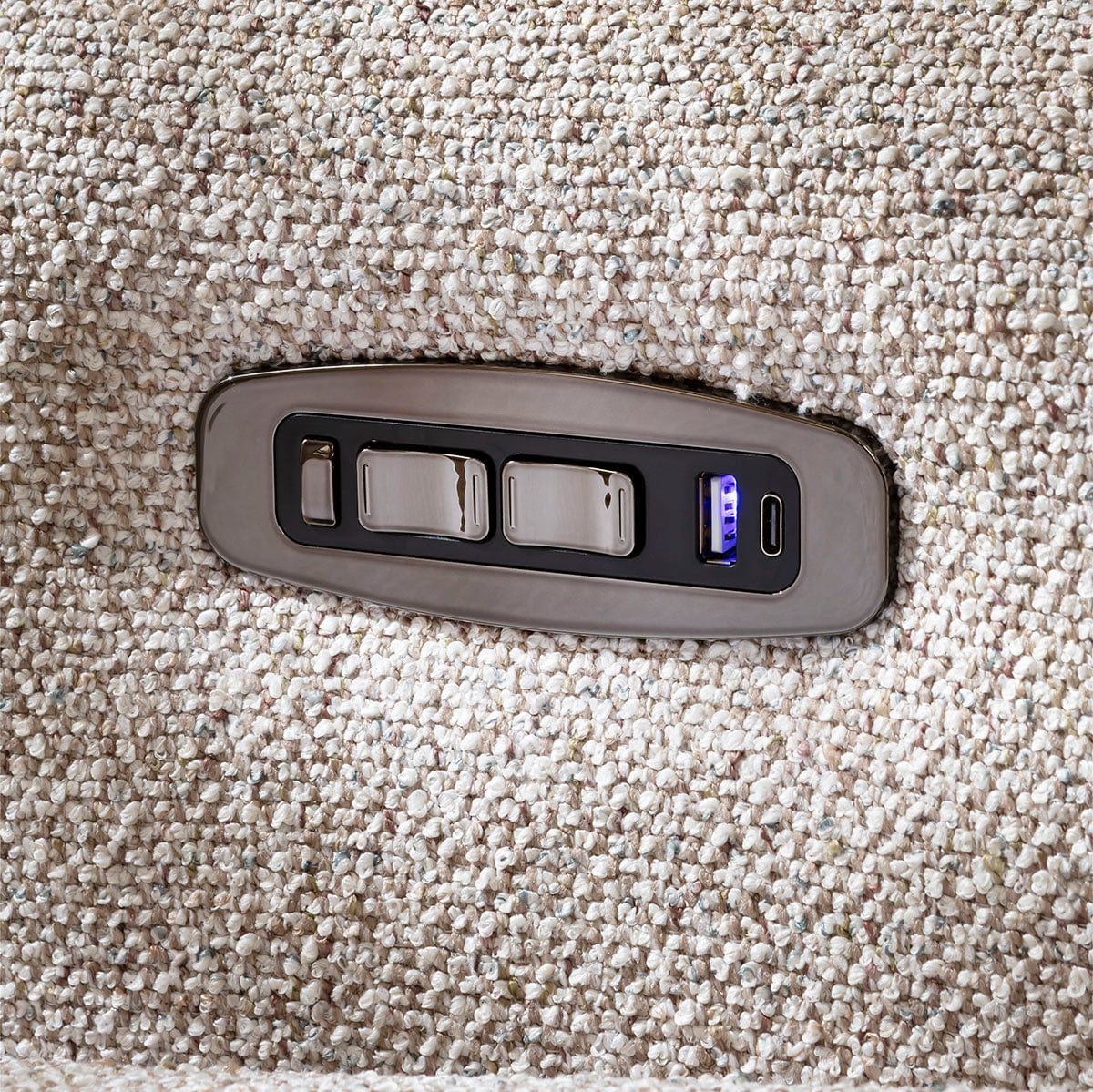 This large corner sofa showcases elegant craftsmanship with a high-back design, built-in power recliners and adjustable headrests for tailored comfort. Inside-arm controls include USB charging meaning you'll never miss a moment. Upholstered in hardwearing woven fabric in beige with natural green and brown flecks, it delivers an organic, modern look. Supportive cushioning, floor-hugging with low-profile black feet, and fine line-stitched detailing elevate this corner recliner sofa to true designer status.