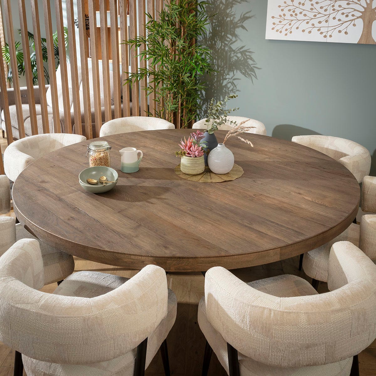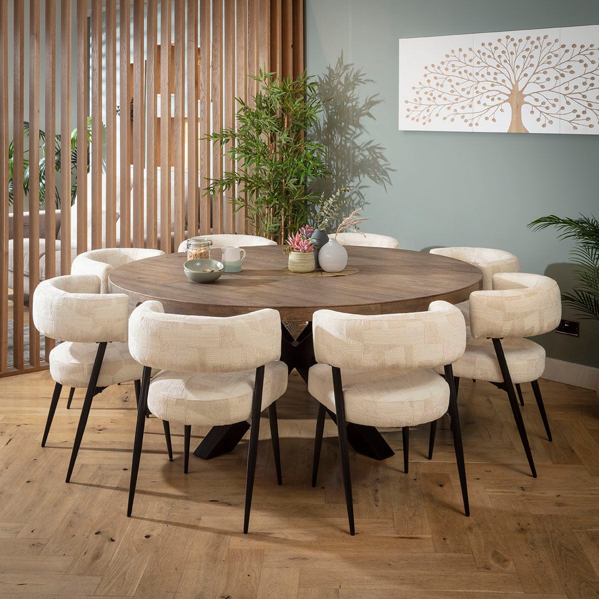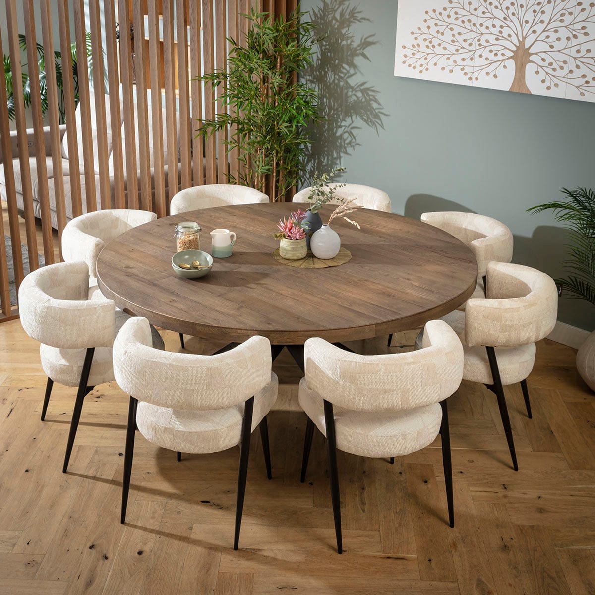 This 8 seater dining table and chair set includes a large round dining table showcasing a reclaimed oak tabletop and a black metal pedestal base, with unique cream dining chairs that make a statement featuring a white textured weave and soft chenille. This modern dining set is crafted for durability and comfort.