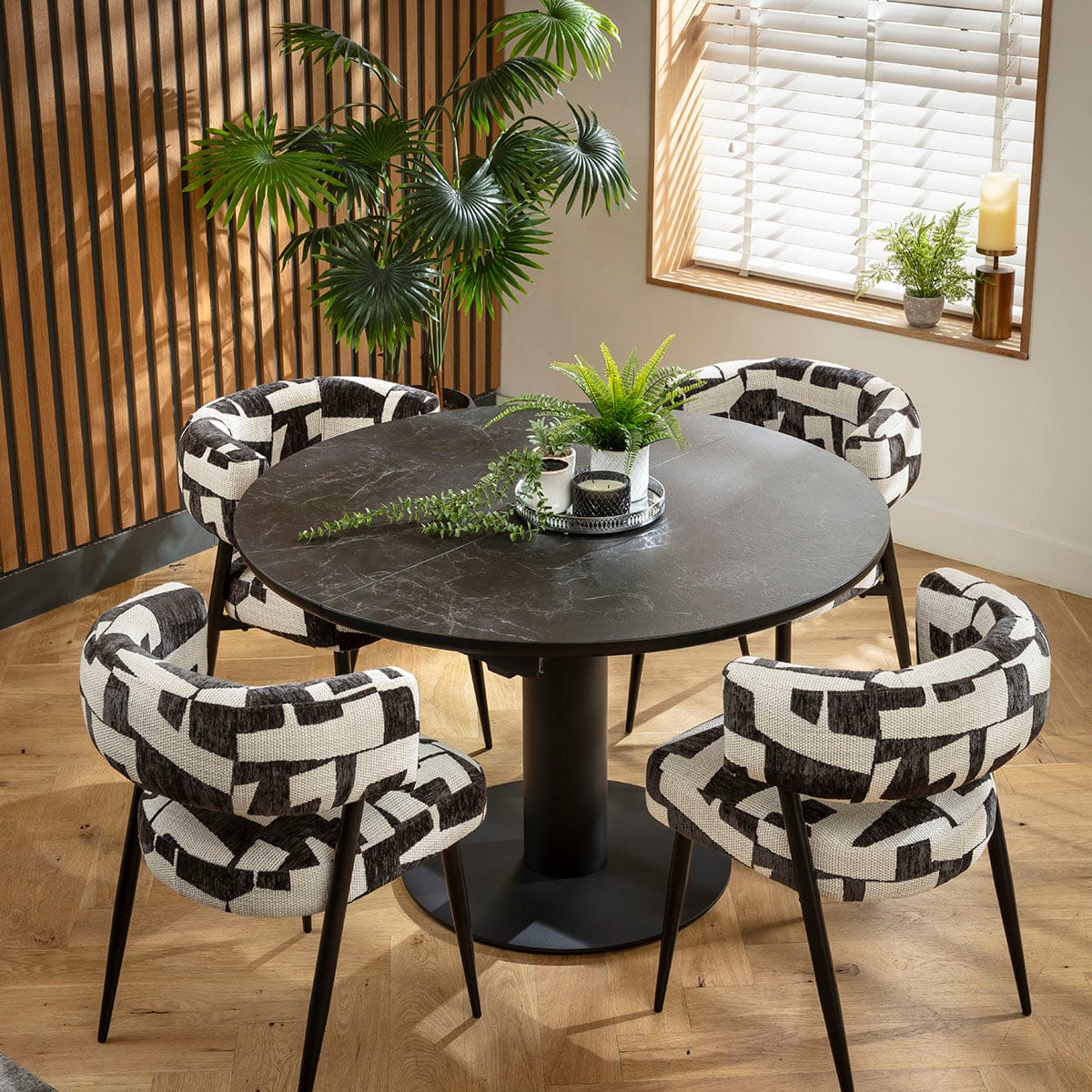 This 4 seater dining table and chair set includes a black round dining table boasting a marble-effect top that extends into an oval dining table, with unique black dining chairs that make a statement featuring a white textured weave and soft chenille. This modern dining set is crafted for durability and comfort.