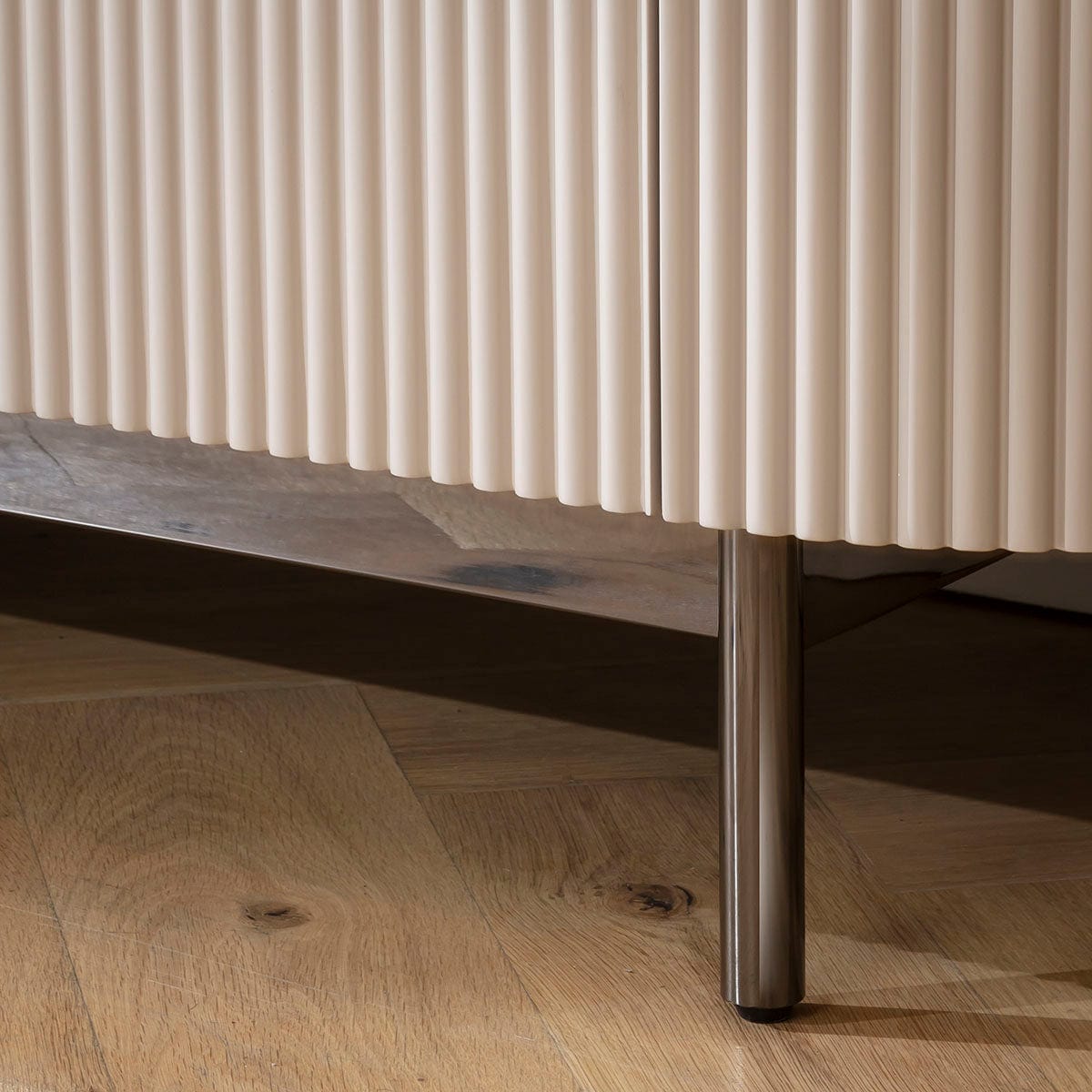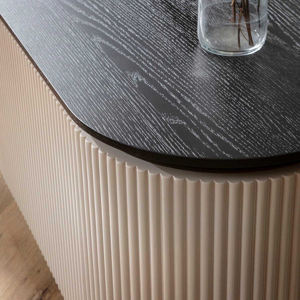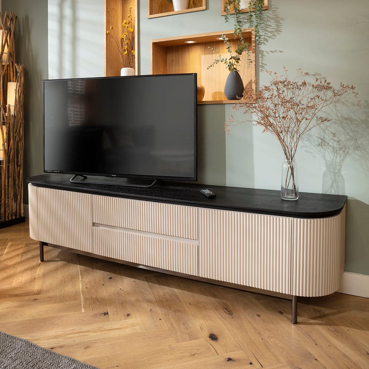Crafted with a round fluted wood body, this 210cm wide television unit stands out with its bold modern presence. A matte chalk painted finish pairs elegantly with a durable black wooden top, while two spacious soft-close drawers and cupboards enhance everyday use. Supplied preassembled, you’ll simply attach the smoked metal legs.