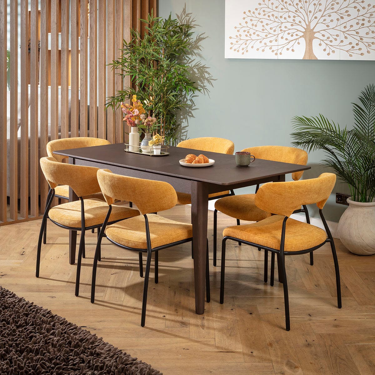This 6 seater dining table and chair set includes a compact extendable wooden dining table showcasing a brown oak veneer and a tactile wood grain, with modern dining chairs combining a black metal frame and yellow gold upholstered seat and backrest. This modern dining set is crafted for durability and comfort.