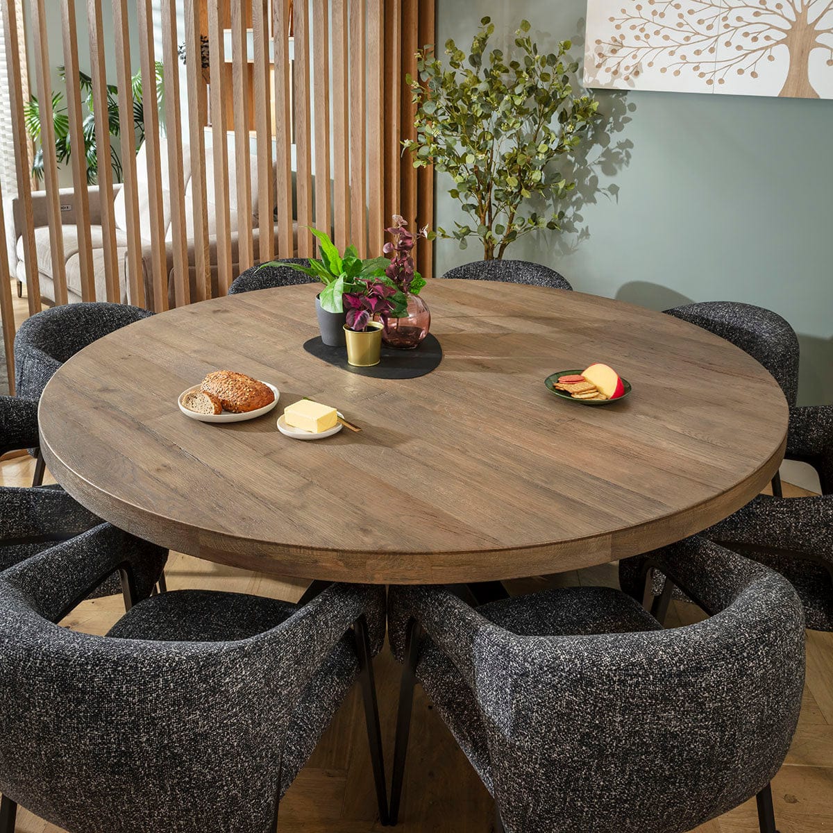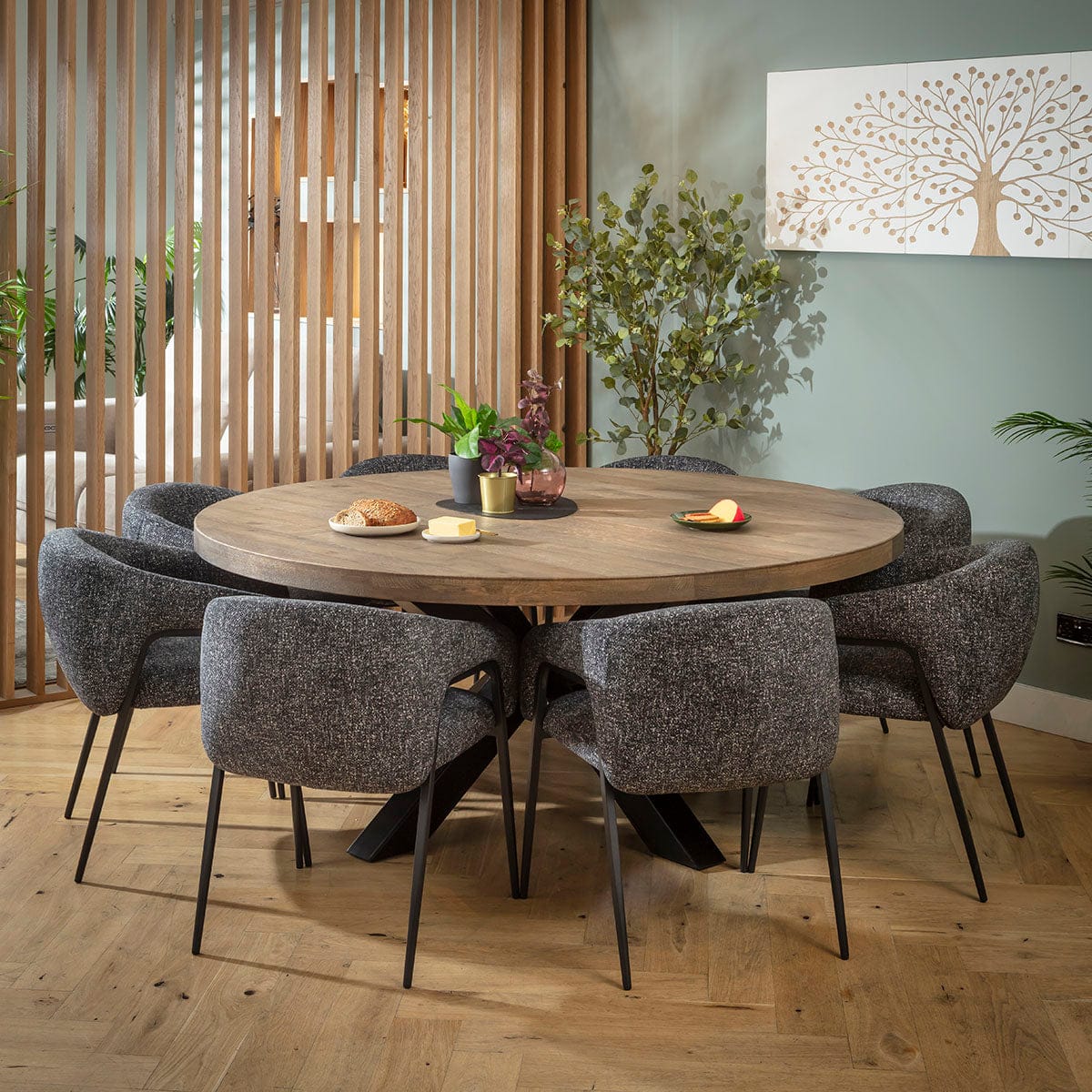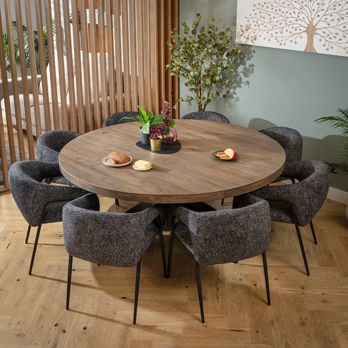 This 8 seater dining table and chair set includes a large round dining table showcasing a reclaimed oak tabletop and a black metal pedestal base, with dark grey dining chairs featuring a unique silhouette and hardwearing fabric upholstery. This modern dining set is crafted for durability and comfort.