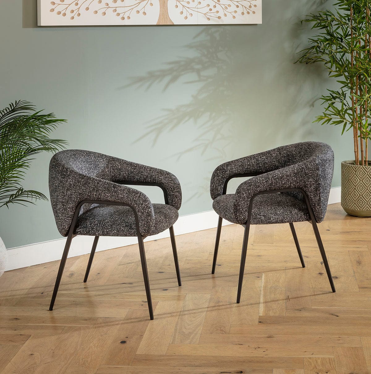 The Peyton dining chairs showcase a modern silhouette with dark grey fabric upholstery in a soft, hardwearing finish. The carver design with arms, low-profile back and supportive 48cm seat height offer excellent comfort. Completed with a black metal frame featuring a unique arm cut-out and slim legs, they deliver a fresh, contemporary shape ideal for modern interiors.