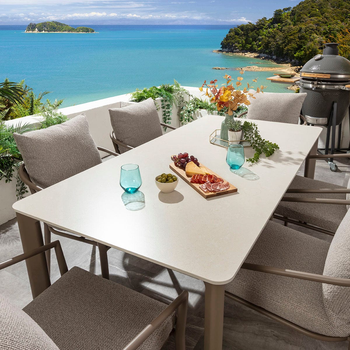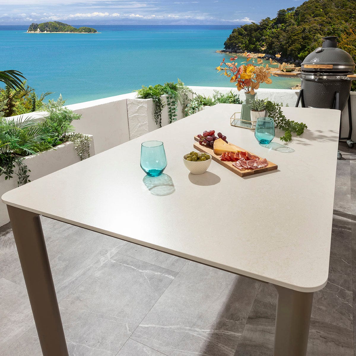 The Pharos table showcases a modern garden dining table design built from super durable aluminium. Its weatherproof aluminium frame supports a 100mm ceramic top with a subtle textured pattern. Rounded edges soften the silhouette, while the simple four leg layout allows easy seating for six or up to eight comfortably.
