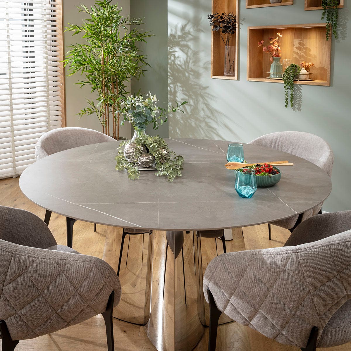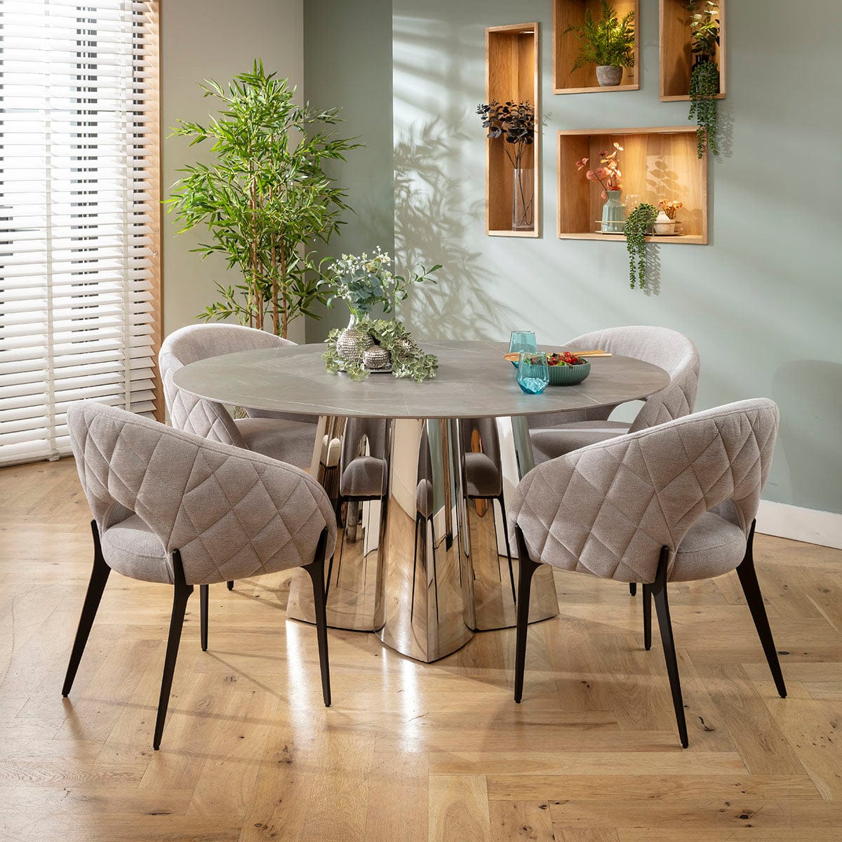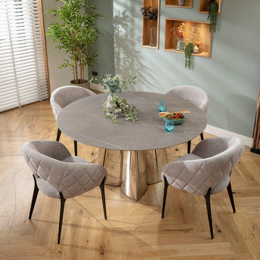 This 4 seater dining table and chair set includes a round ceramic marble dining room table in grey adorned with a unique metal base, with grey dining chairs boasting diamond-quilted detailing and black metal legs. This modern dining set is crafted for durability and comfort.
