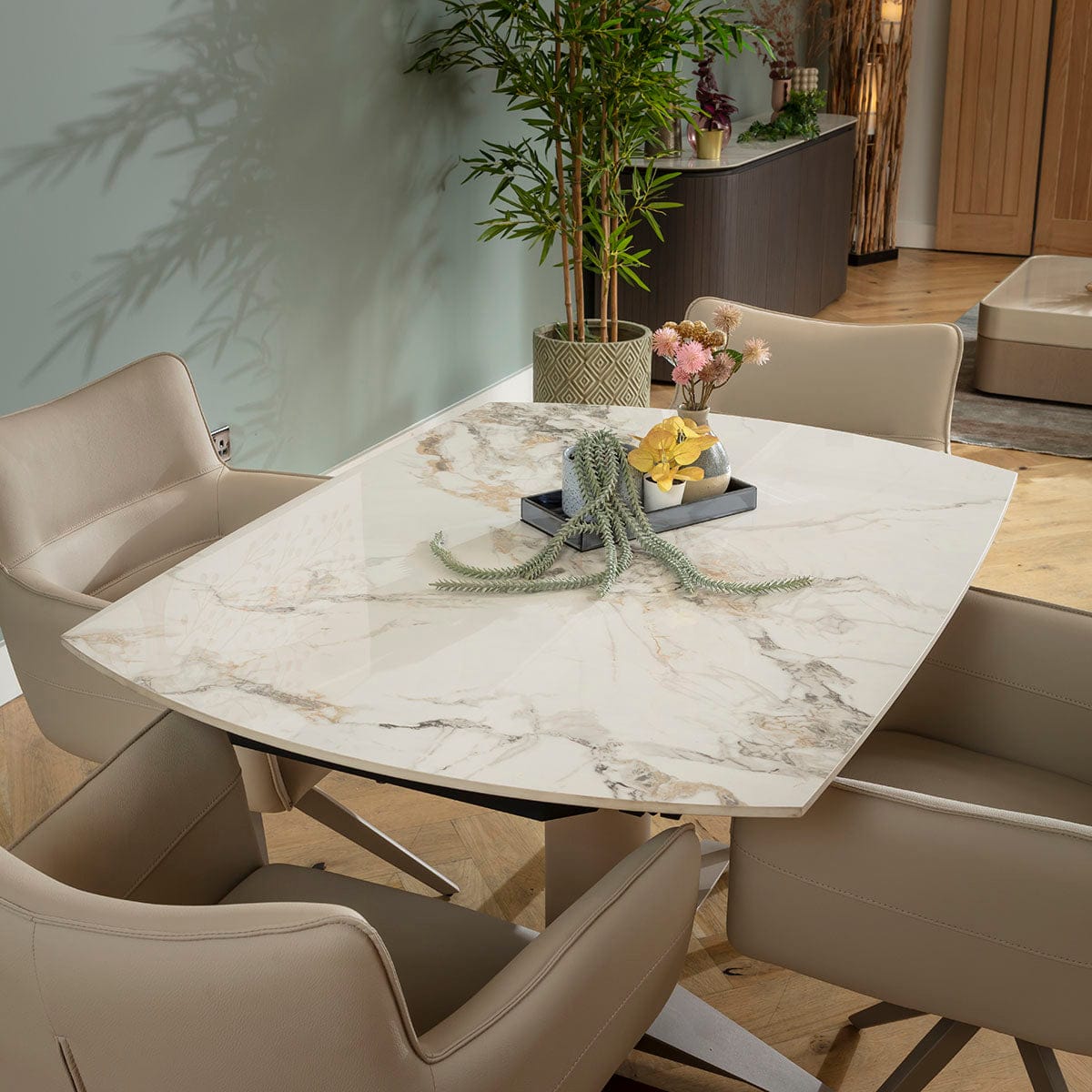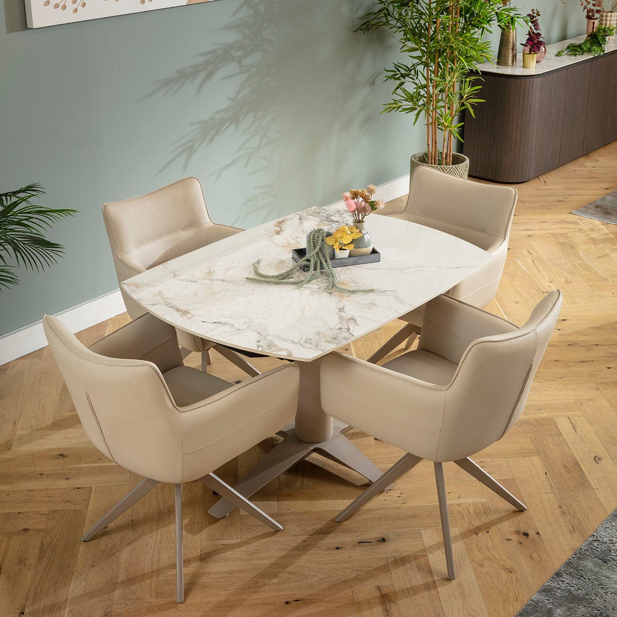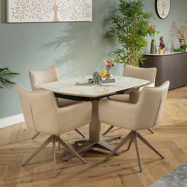 This 4 seater dining table and chair set includes a marble-effect extendable dining table that blends style with expert engineering in beige and white, with modern faux leather dining chairs featuring a return swivel base in beige. This modern dining set is crafted for durability and comfort.