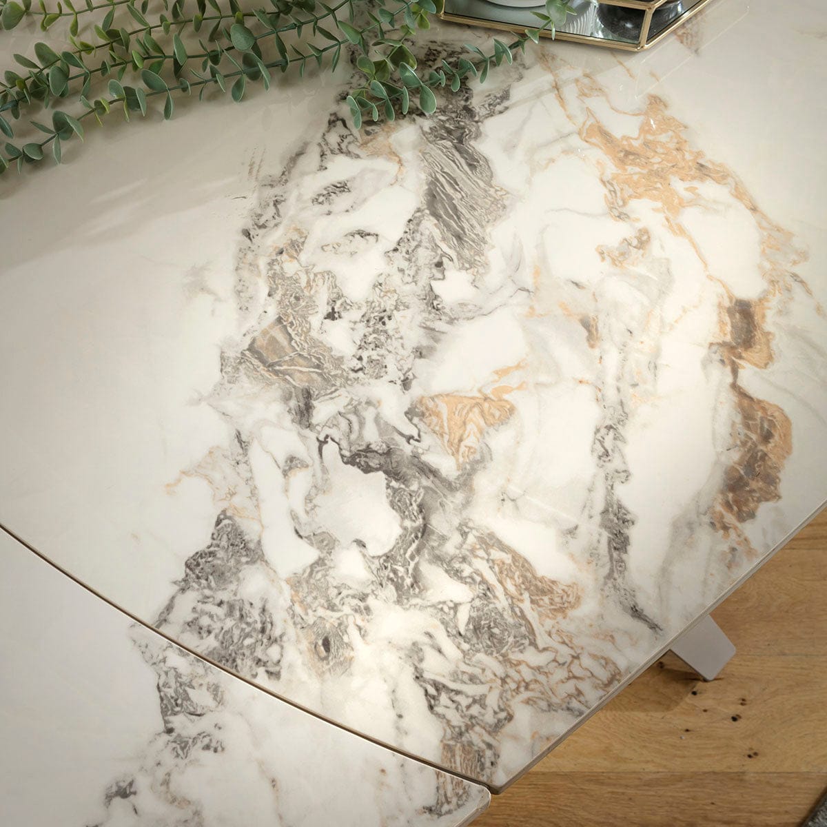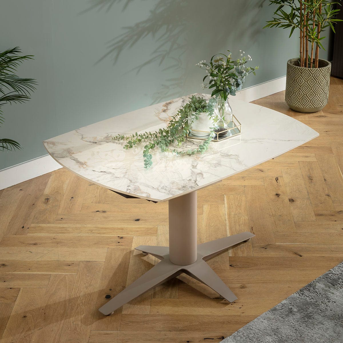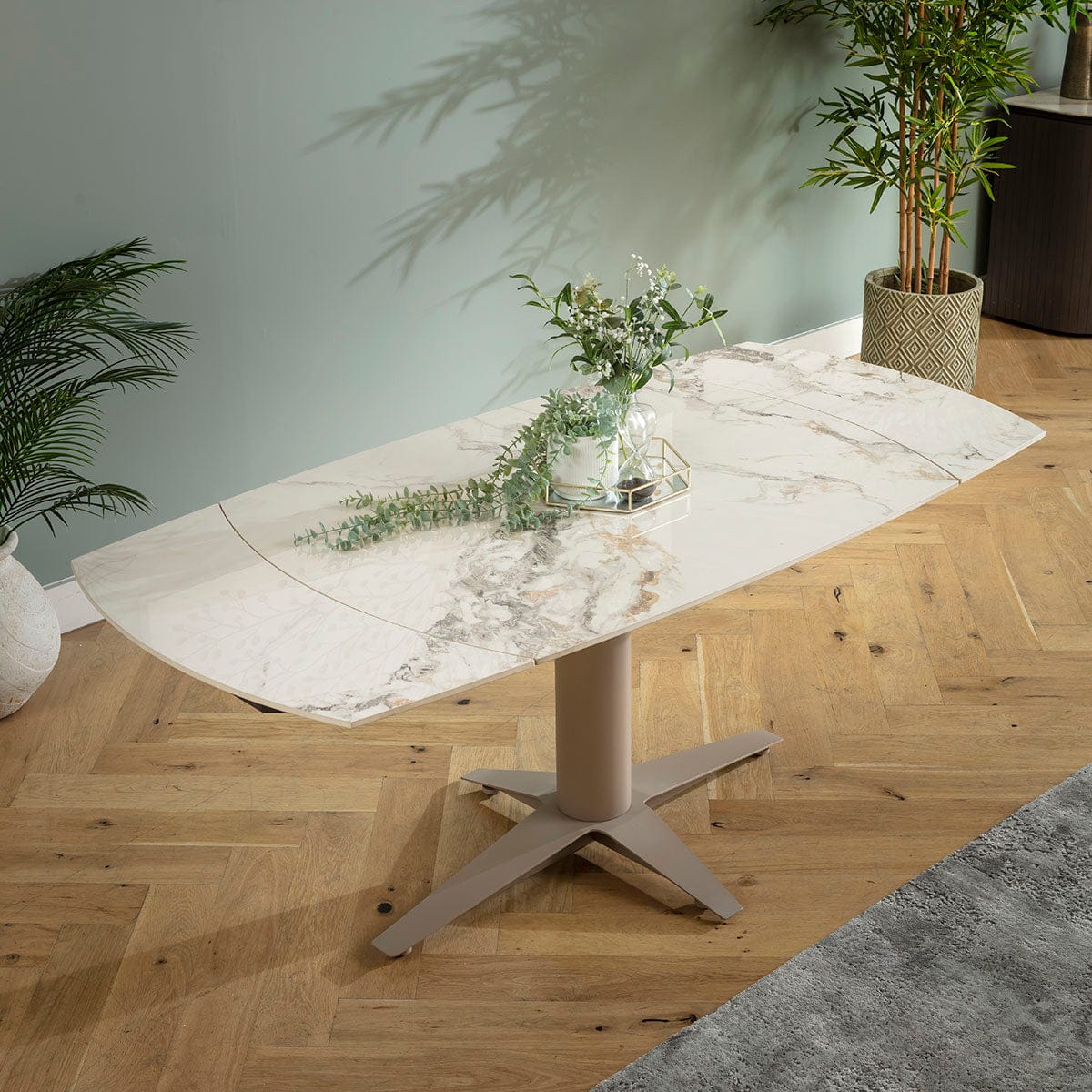 The small Johnson extendable dining table introduces a unique colour palette with a white ceramic marble top enhanced by graceful veining. The polished surface offers refinement while ceramic resists scratches, stains and heat. A beige metal base with a distinctive modern silhouette supports the 4 seater format. Curved edges soften the geometry, giving the piece an elegant, contemporary character. Measuring 120 x 88cm and reaching 160cm when opened, the tabletop extends effortlessly as concealed leaves emerge while you rotate it using the innovative auto-extend mechanism. Closing leaves no separation, keeping the surface flawless. Premium ceramic and robust steel ensure lasting strength. Quatropi stands for quality, backed by superior craftsmanship.