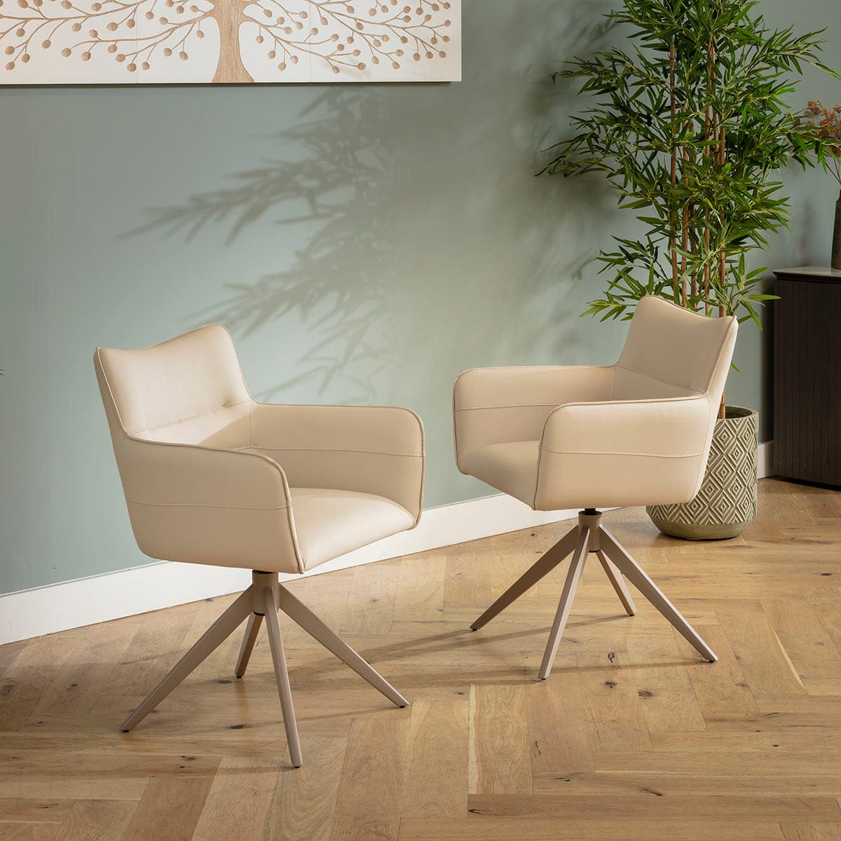 The Ruby modern faux leather dining chairs bring style and comfort to any home. These 4 beige carver chairs with arms deliver effortless comfort with their generous 62cm width, 60cm depth, 49cm seat height and 67cm arm height. Premium stitching enhances the supportive 37cm high back, while the return swivel base and four-point metal frame, finished in soft beige paint, ensure smooth movement and balanced elegance.