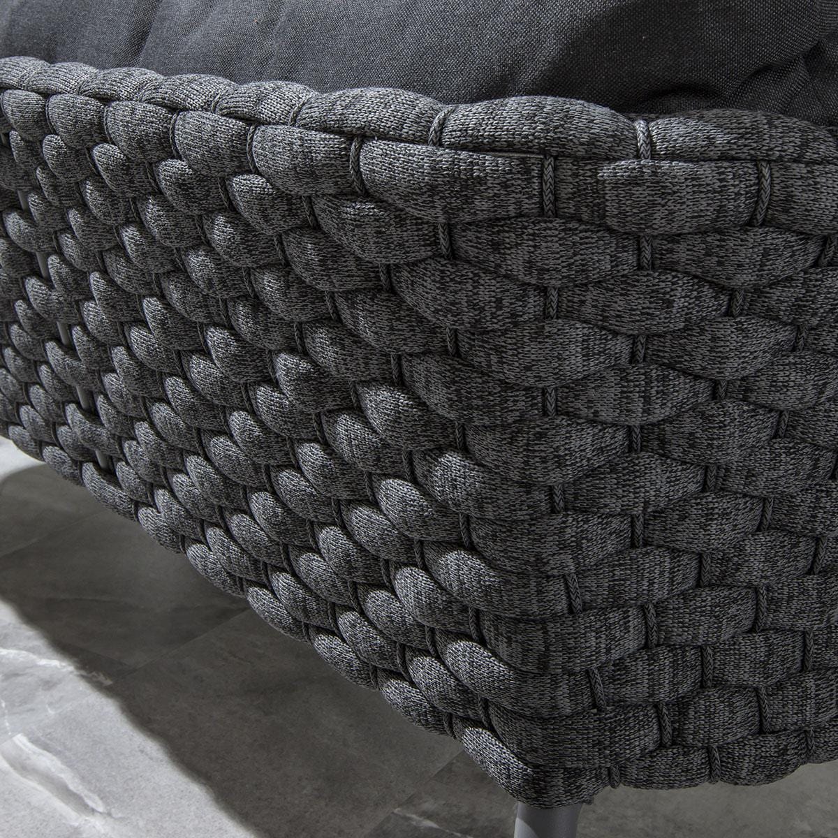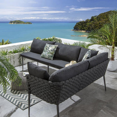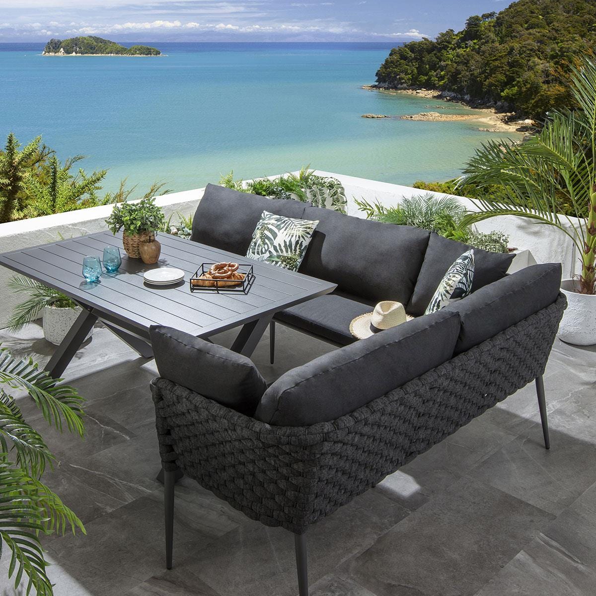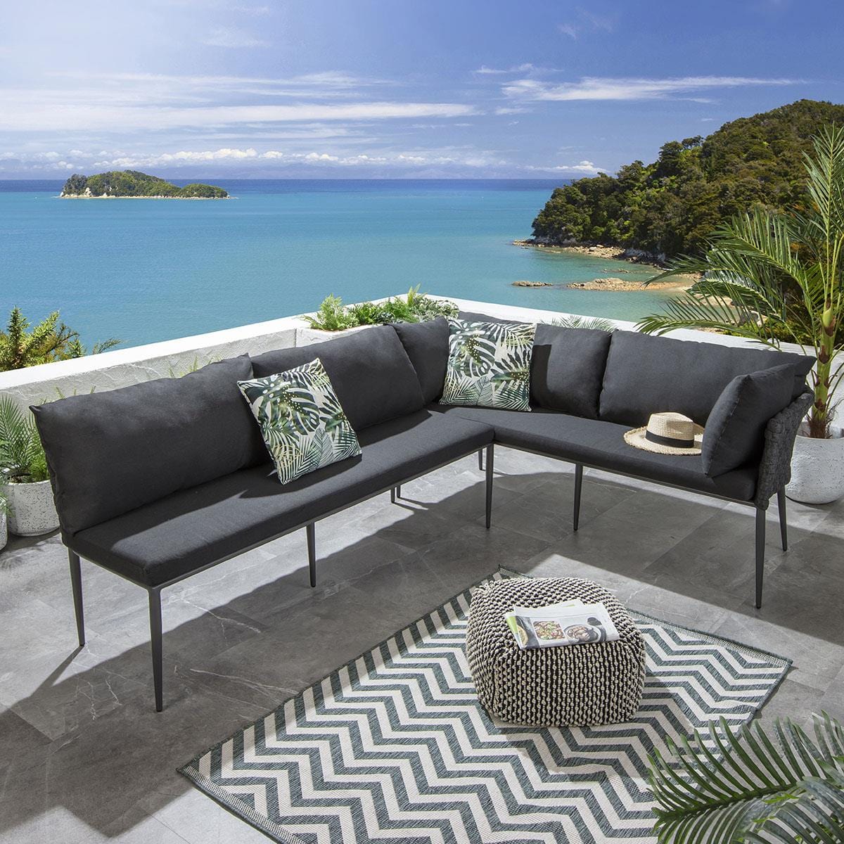 A versatile addition to any patio furniture set, the Sundowner premium garden corner dining bench. Crafted with luxury in mind, this charcoal grey bench features our signature Sundowner rope weave on its sides and backrest, exuding elegance and style. Corner seating is perfect for lounging or dining alfresco.