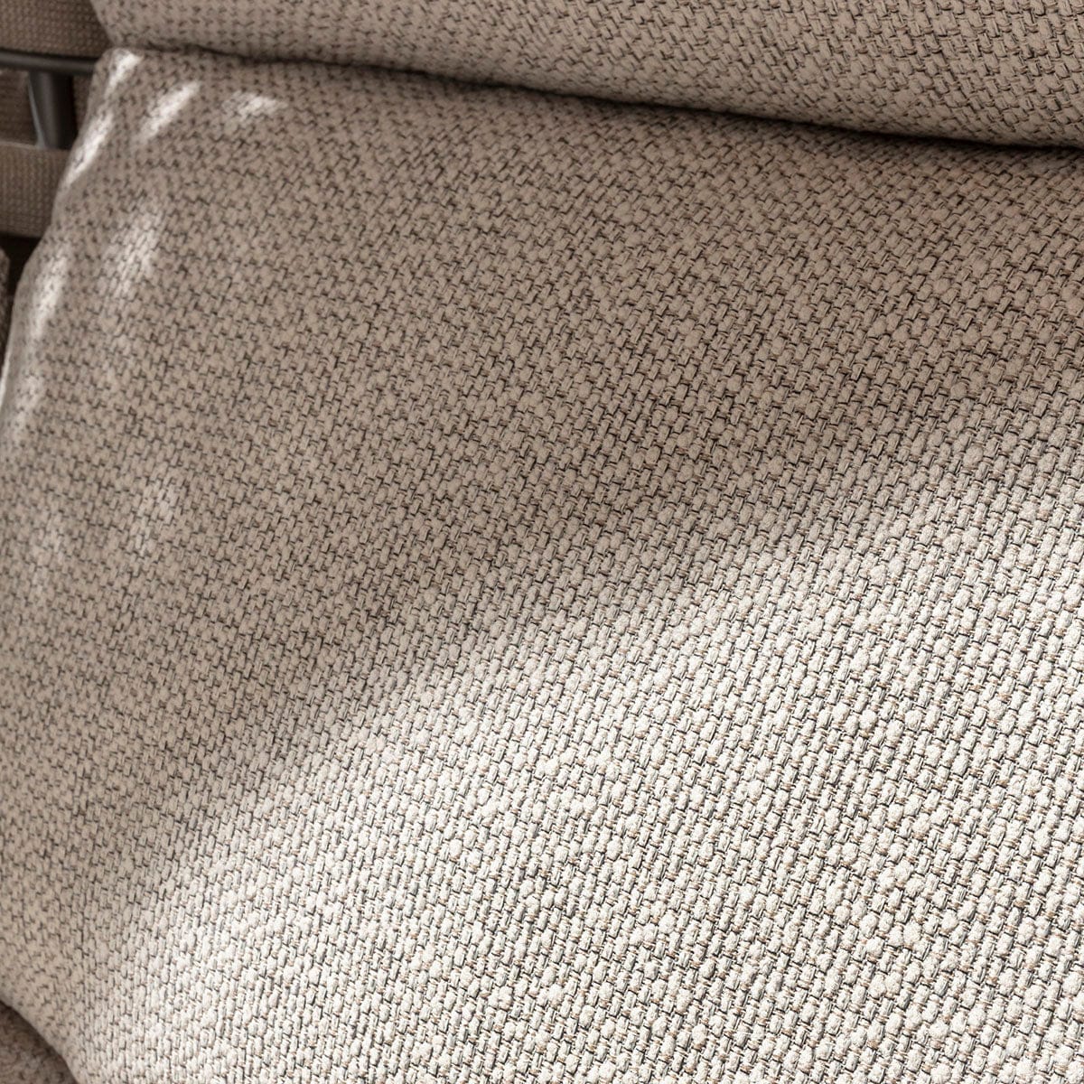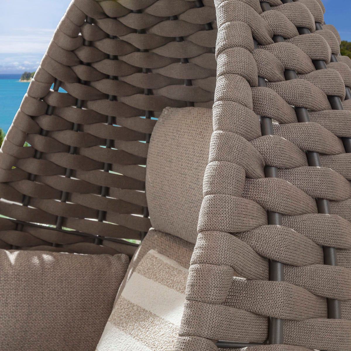 This large, spacious seating piece is formed from a light yet durable aluminium basket, finished in coffee beige Sundowner Signature rope weave - a premium outdoor material. Sofa-inspired luxury cushions in latte cream fabric provide indulgent comfort and should be stored when not in use. Suspended from a brown powder-coated steel frame for superior strength, its sleek silhouette reflects a market-leading design. A beige weather cover is included to guard against garden debris.